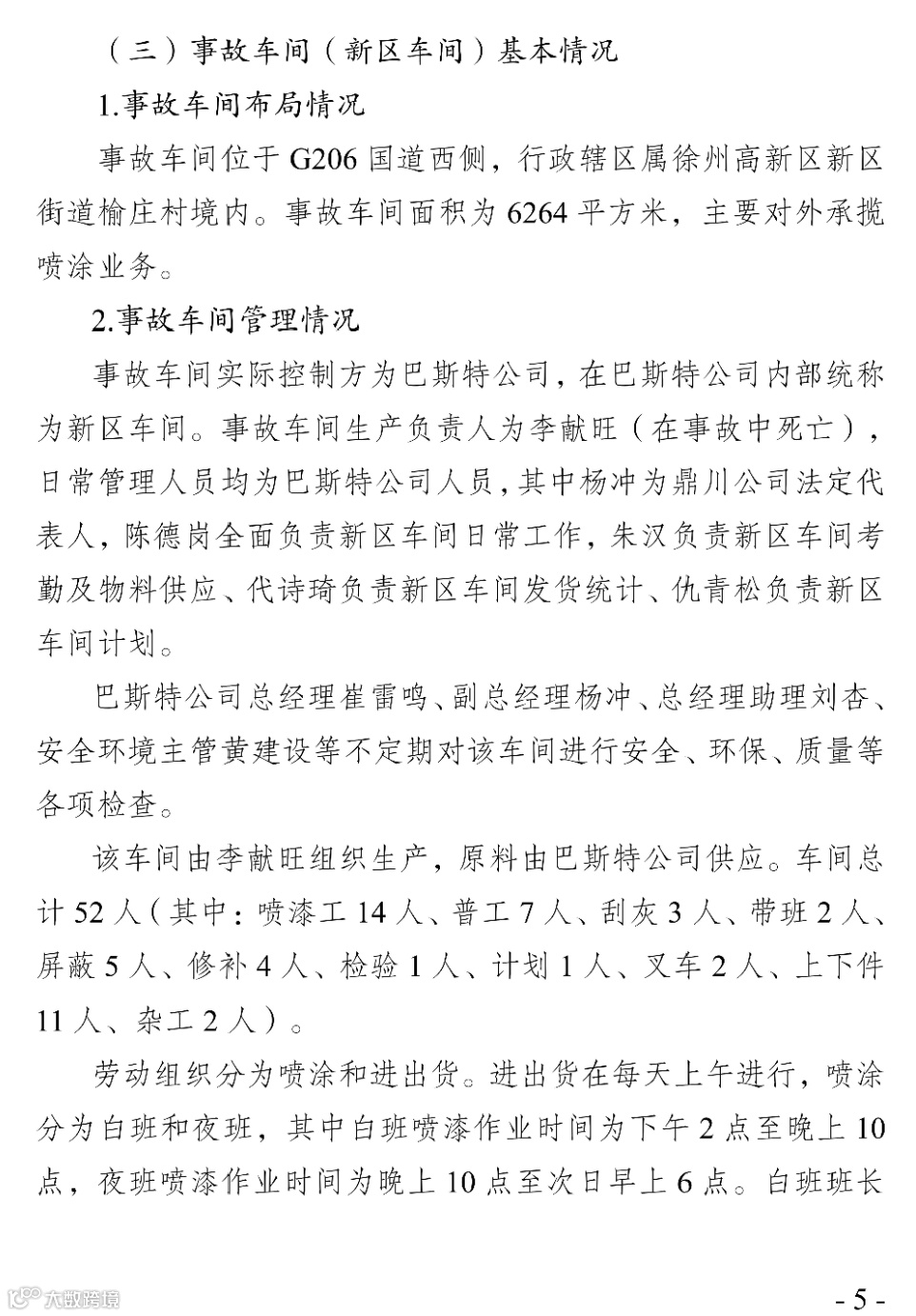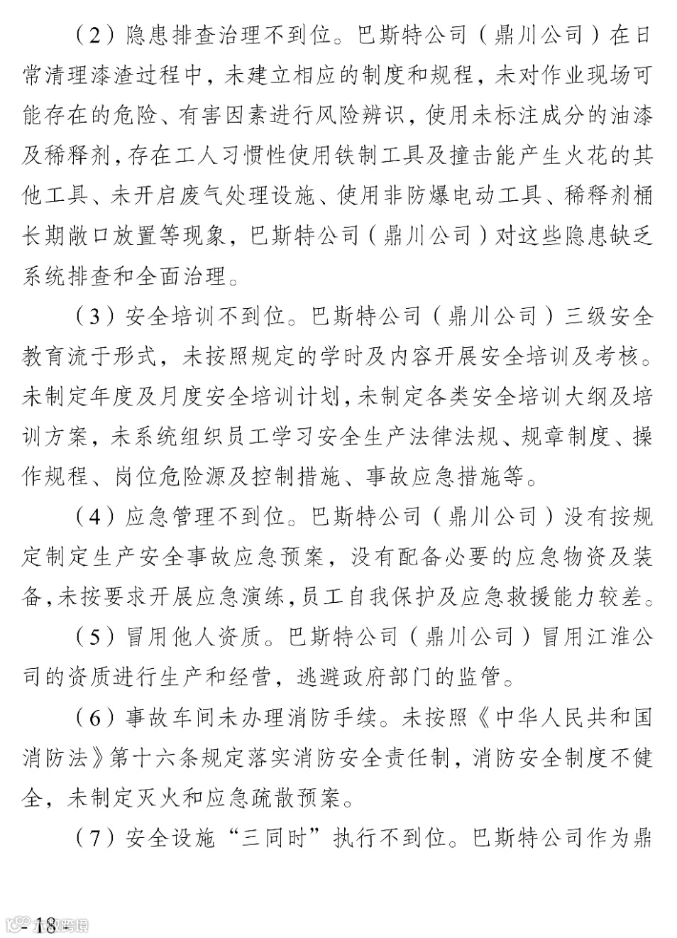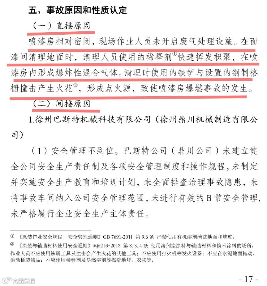 事故调查报告中指出该事故的直接原因是喷漆房相对密闭,现场作业人员未开启废气处理设施。在面漆间清理地面时,清理人员使用的稀释剂快速挥发积聚,在喷漆房内形成爆炸性混合气体。清理时使用的铁铲与设置的钢制格栅撞击产生火花,形成点火源,致使喷漆房爆燃事故的发生。以下为本次事故的调查报告。