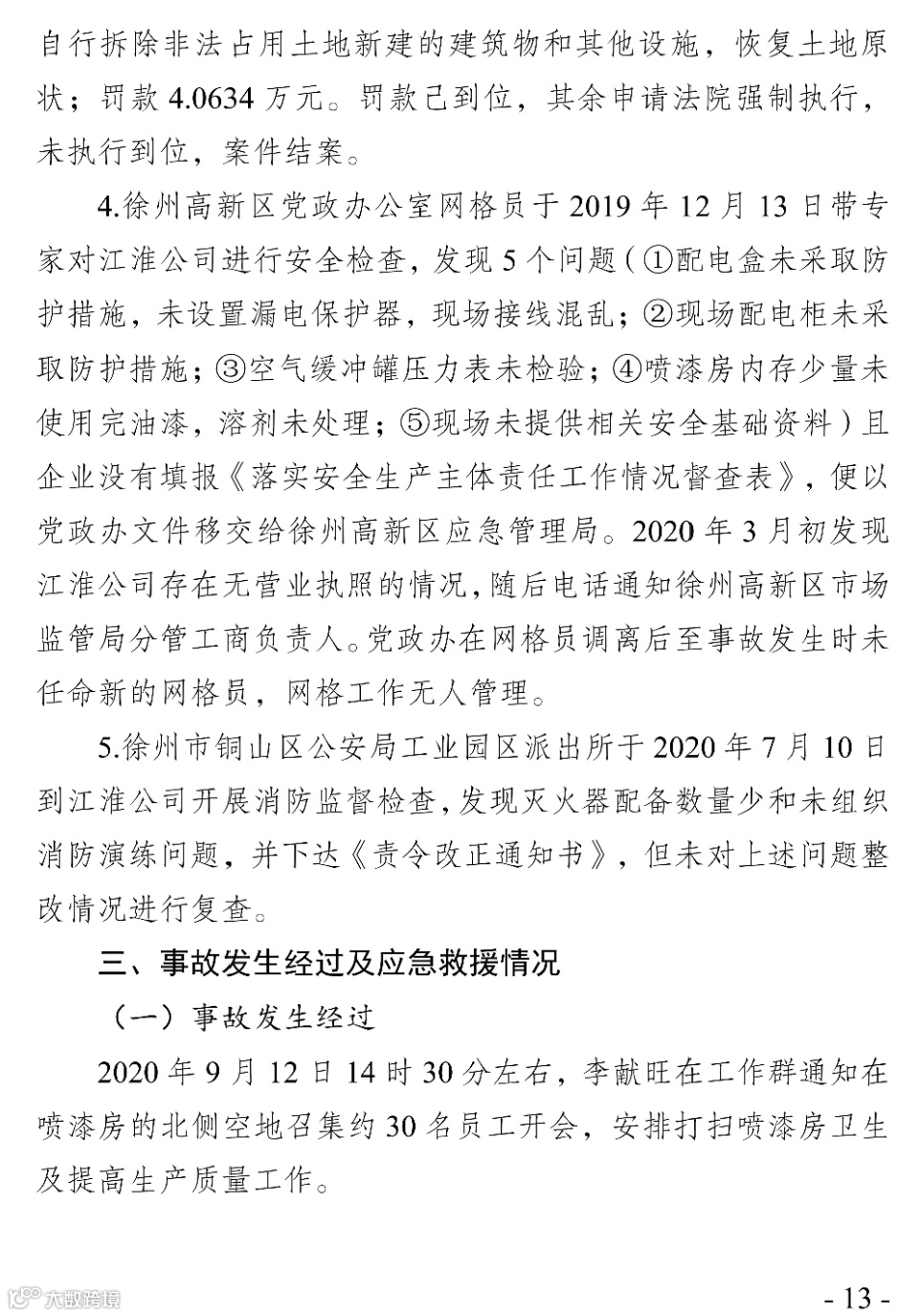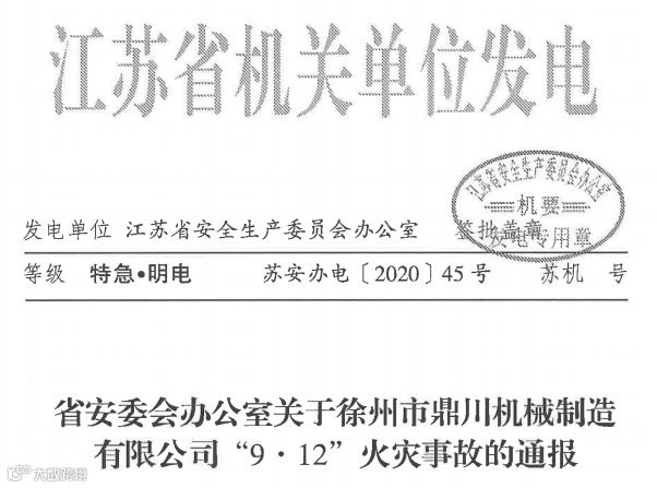 图为江苏省安委办专门下发的《关于徐州市鼎川机械制造有限公司“9·12”火灾事故的通报》(苏安办电〔2020〕45号)