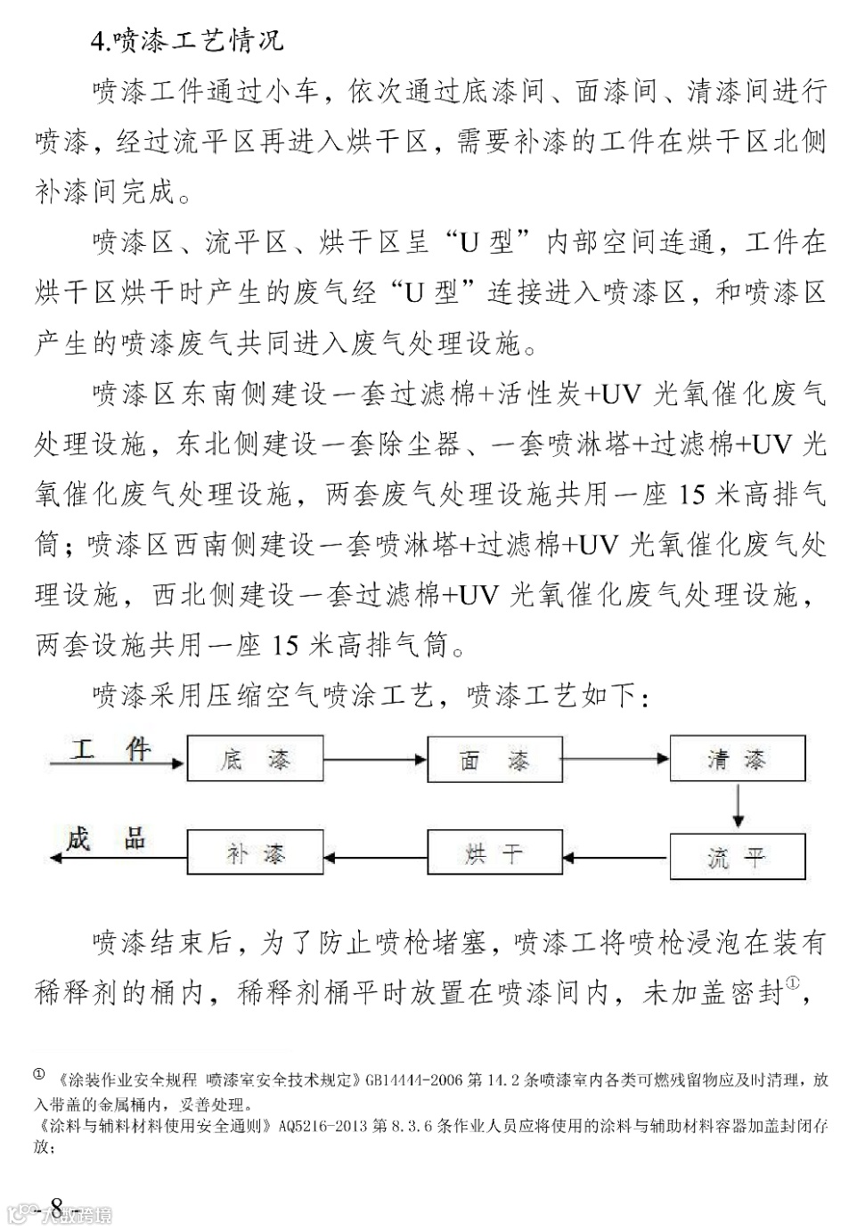 废气治理设备既是解决企业达标排放的环保装备,同时也是保障企业安全生产的重要辅助设备。下面的事故案例进一步证明了废气治理设备对企业保障安全生产的重要性。据事故调查报告显示,该事故的直接原因是喷漆房相对密闭,现场作业人员未开启废气处理设施。在面漆间清理地面时,清理人员使用的稀释剂①快速挥发积聚,在喷漆房内形成爆炸性混合气体。清理时使用的铁铲与设置的钢制格栅撞击产生火花②,形成点火源,致使喷漆房爆燃事故的发生。