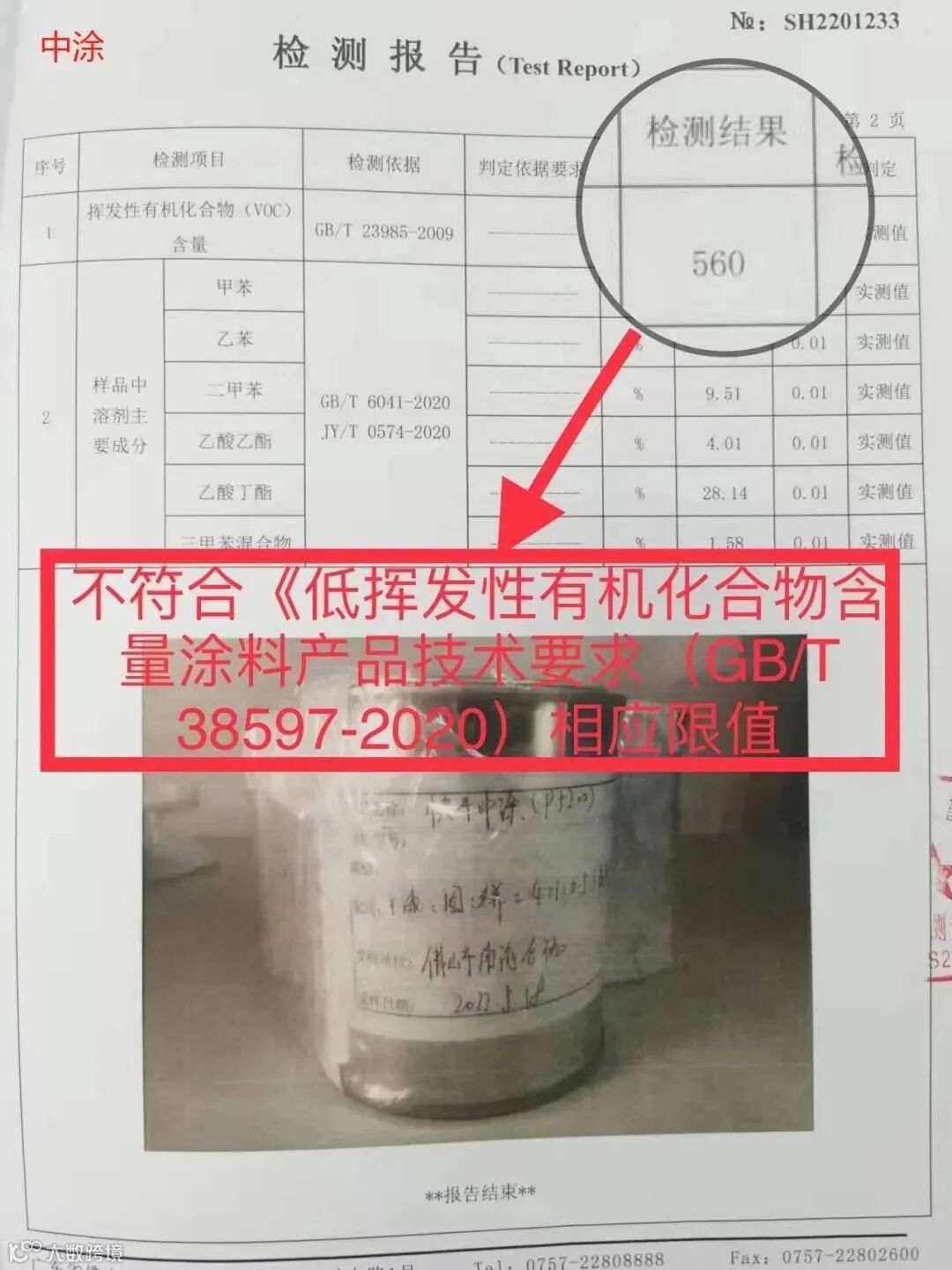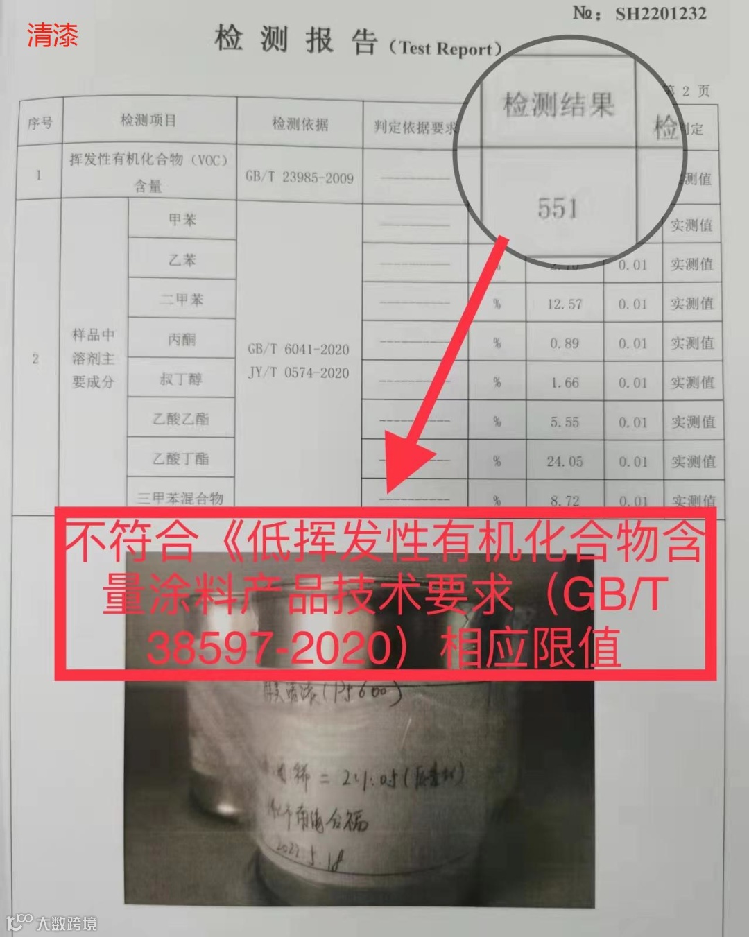 2022年5月25日,检测报告(SH2201232)显示清漆(P5600)的挥发性有机化合物(VOC)含量因子为551g/L;检测报告(SH2201233)显示,快干中涂(P5200)的挥发性有机化合物(VOC)含量因子为560g/L。该检测结果适用标准为中华人民共和国国家标准《低挥发性有机化合物含量涂料产品技术要求(GB/T 38597-2020)表2溶剂型涂料中VOC含量的要求,其中汽车修补用清漆VOC含量因子限量值≤420g/L,汽车修补用底漆VOC含量因子限量值≤540g/L,上述2个因子超标,将进行立案处罚。
