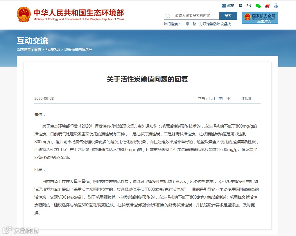 近日,生态环境部于2020年06月24日印发的《2020年挥发性有机物治理攻坚方案》对活性炭指标提出了规定: