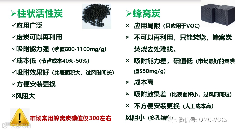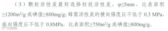 “对于采用颗粒状、柱状等活性炭吸附的,应选择碘值不低于800毫克/克的活性炭;采用蜂窝状活性炭吸附的,建议选择与碘值800毫克/克颗粒状、柱状等活性炭吸附效率相当的蜂窝状活性炭,并按照设计要求足量添加、及时更换。”