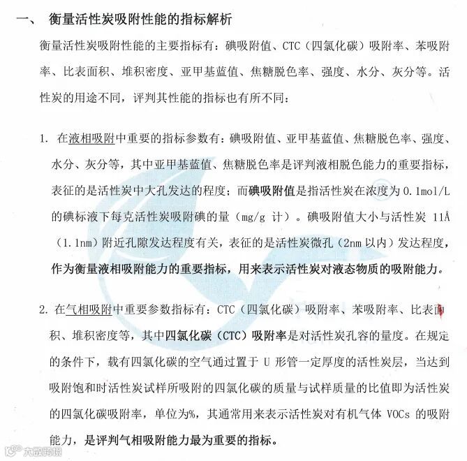 在气相吸附中,四氯化碳(CTC)吸附值为主要衡量指标。