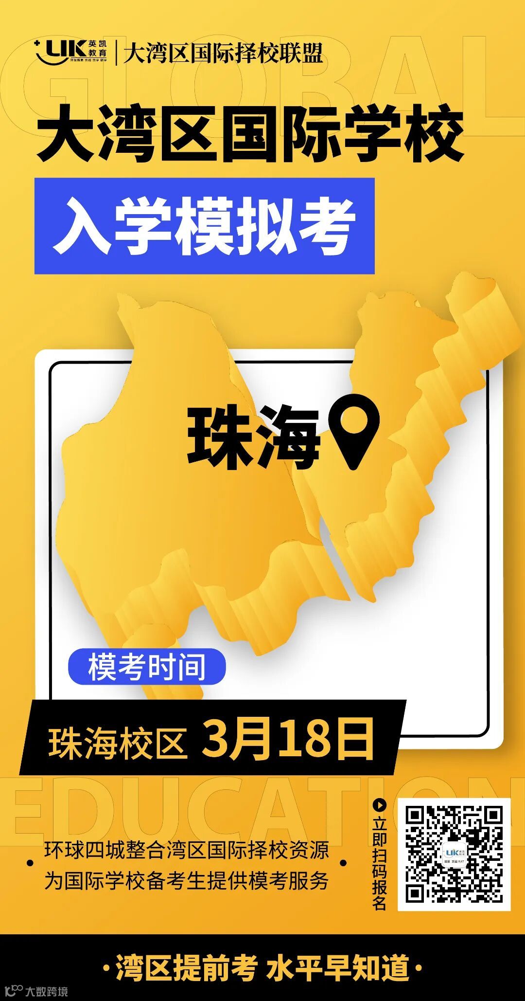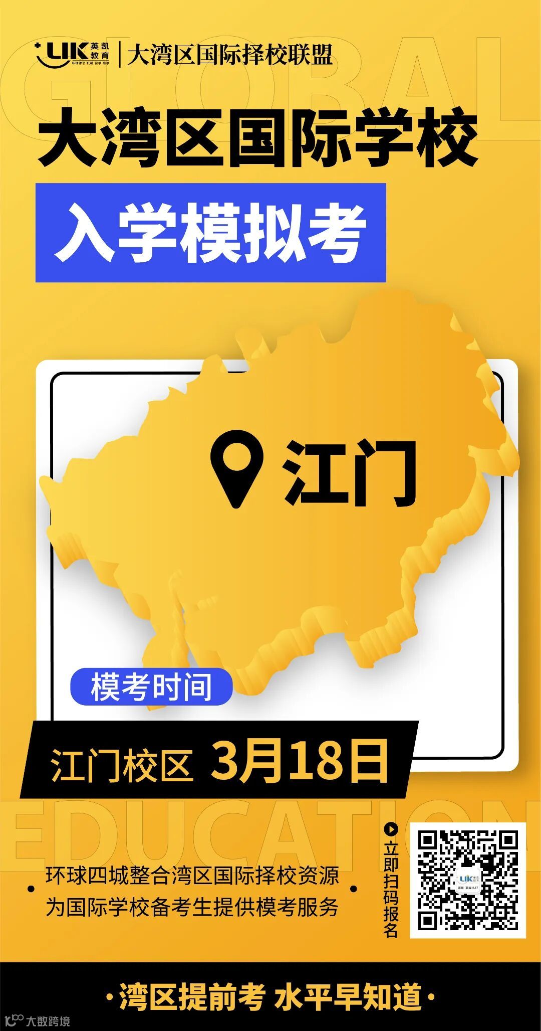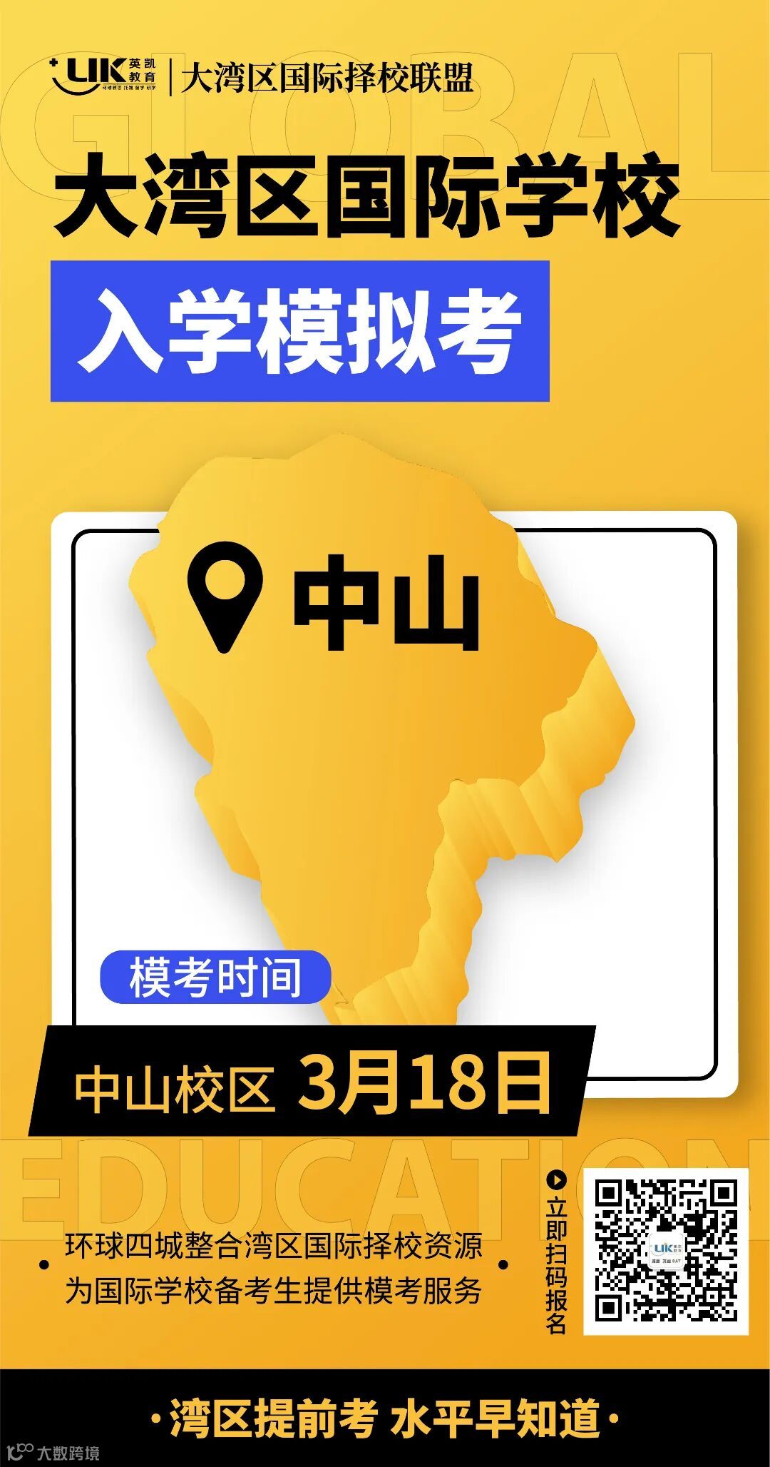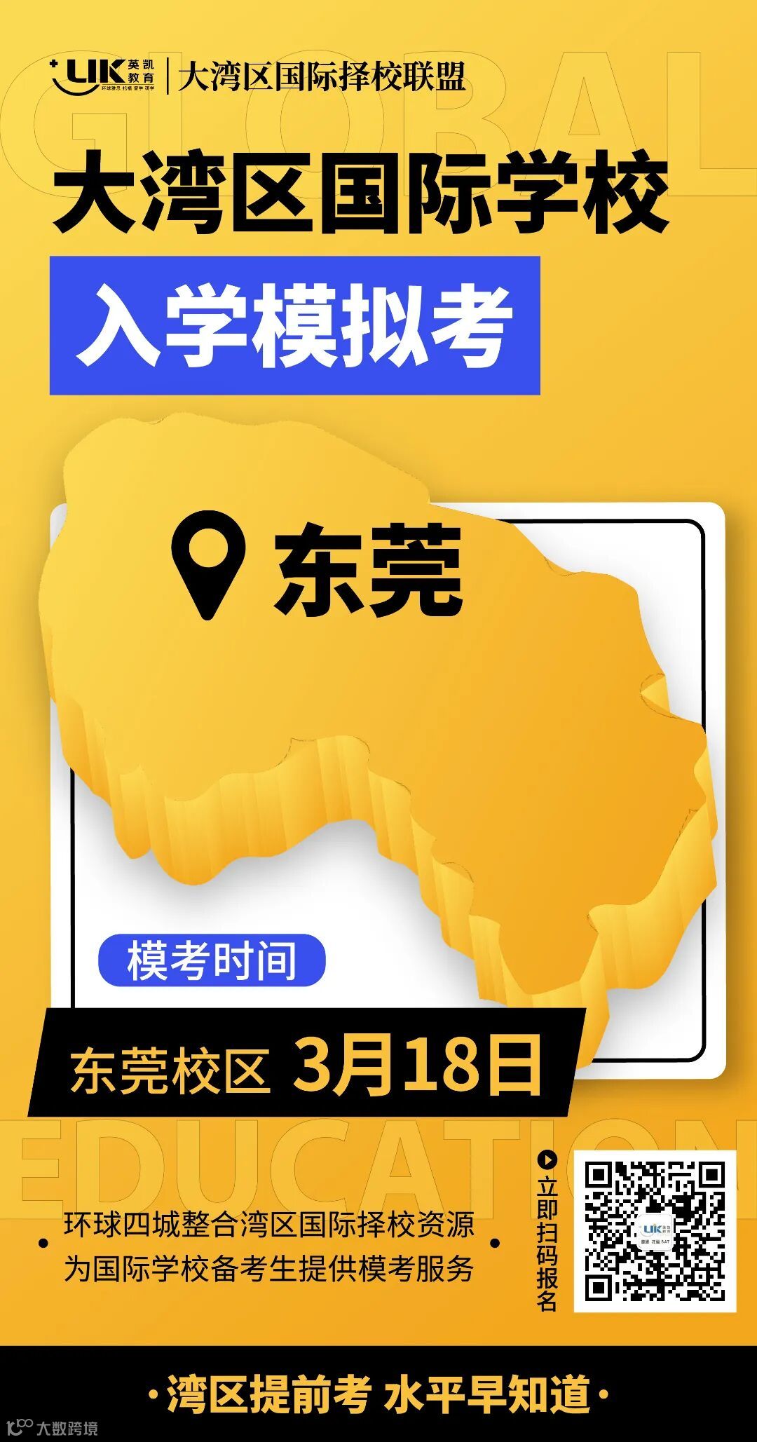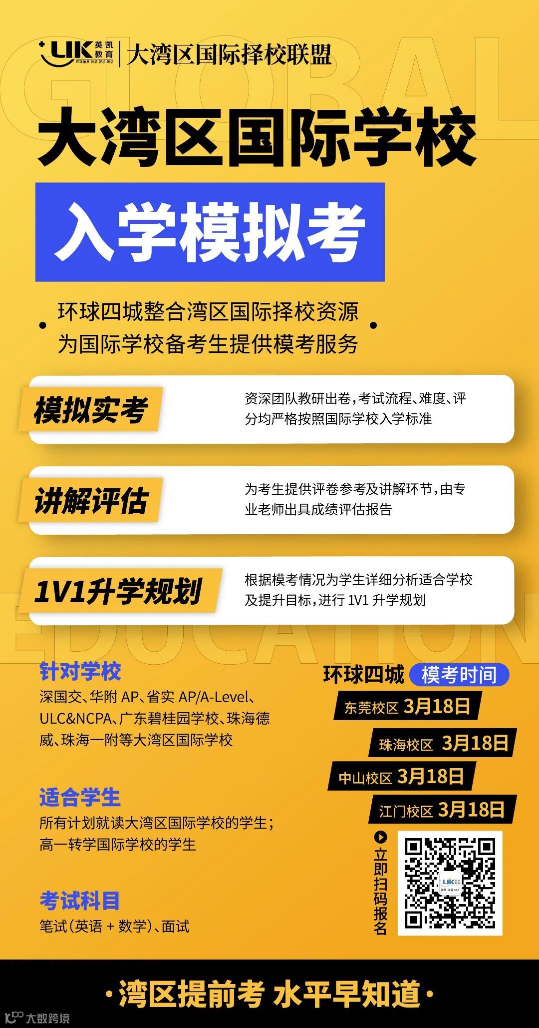 为了让学生提前知道自己的水平,更好地制定学习方案,东莞、珠海、中山、江门环球四城组成了“大湾区国际择校联盟”,整合湾区国际择校资源,共同举办“大湾区国际学校入学模拟考”!