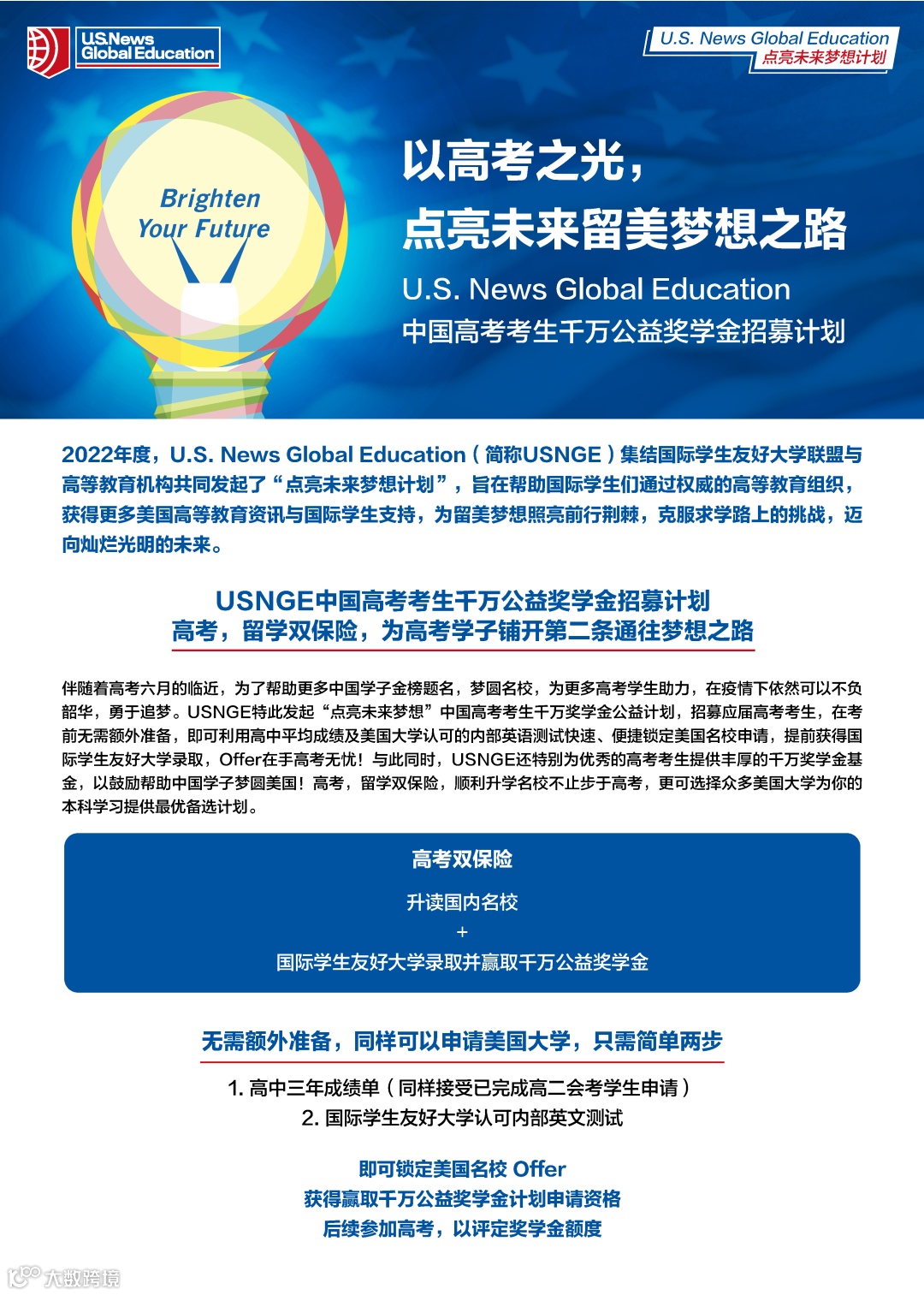 U.S. News Global Education 作为美国新闻与世界报道旗下官方高等教育组织,在2022年度集结国际学生友好大学联盟与高等教育机构共同发起了“点亮未来梦想计划”,同时,针对中国高考学生我们正式启动“点亮未来梦想计划——中国高考考生千万公益奖学金招募计划“,在此高考之际,对于同时面临着疫情挑战的中国高考学子们,可以助力你们不负韶华,勇于追梦。