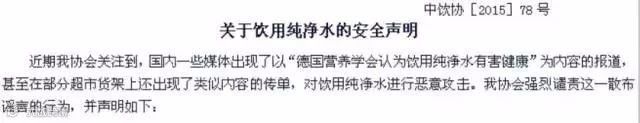 中饮协《关于饮用纯净水的安全声明》文中也提到:作为指导各国安全饮水的权威文件,世界卫生组织《饮用水水质准则》从未对水中矿物质含量做过任何推荐。