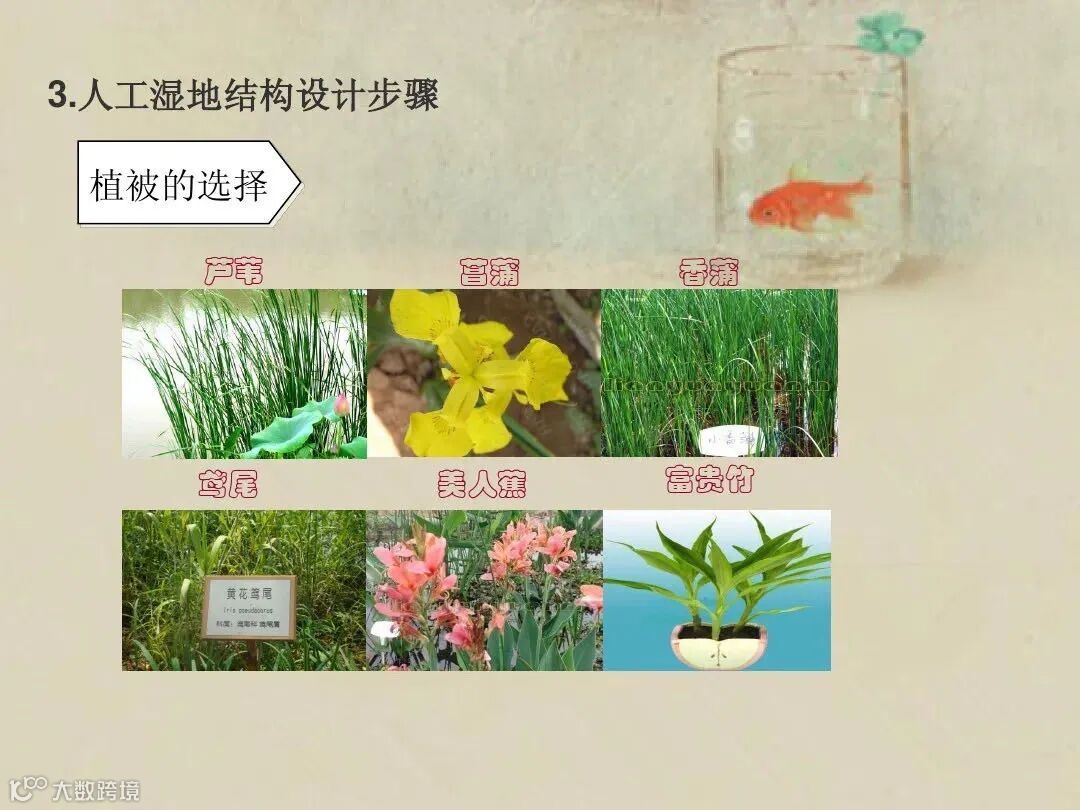 生态净化池:生态净化池面积占治理设施总面积的50%左右,主要利用不同营养层次的水生生物最大程度去除水体污染物。池内可种植沉水、挺水、浮叶等各类水生植物,以吸收净化水体中的氮、磷等营养盐(覆盖面积不小于生态净化池40%);可适当放养鲢、鳙、鲻鱼、贝类等滤食性水生动物。一般生态净化池底部种植沉水植物(苦草、轮叶黑藻、伊乐藻等)、浮叶植物(如睡莲),四周岸边种植挺水植物(茭白、美人蕉、鸢尾等),合理选择植物种类,分类搭配,保证四季均有植物生长(备注:严禁栽种水浮莲等入侵植物)。可安置喷泉式曝气设备。