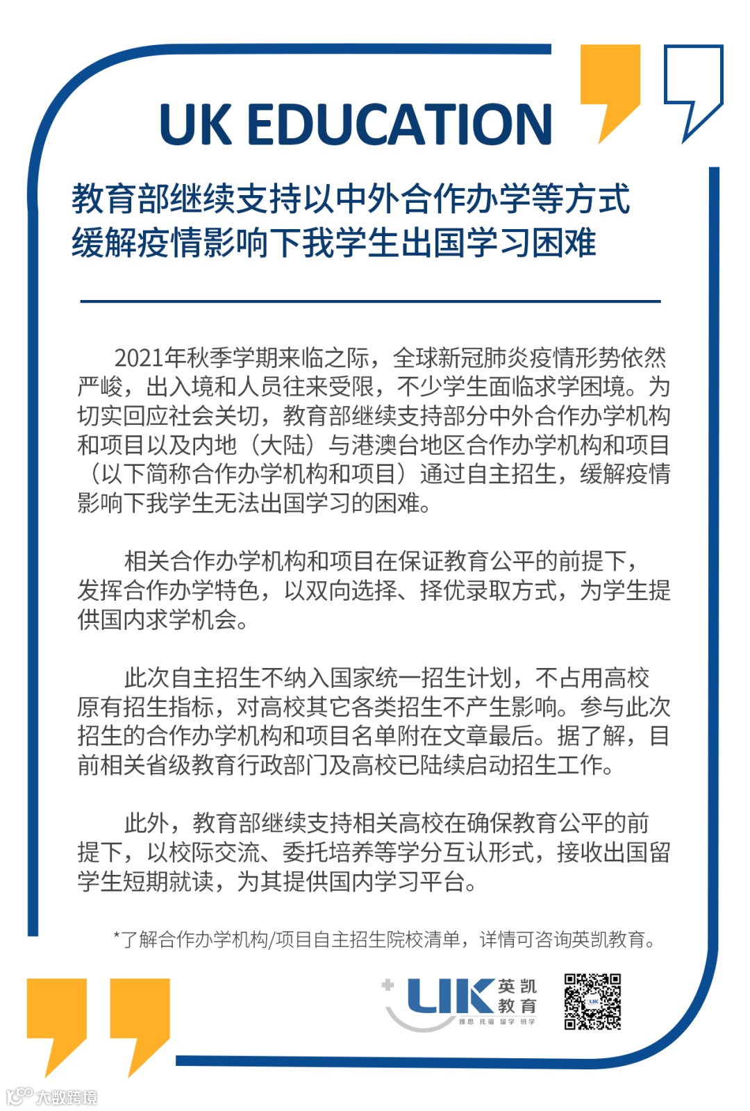 2021年秋季学期来临之际,全球新冠肺炎疫情形势依然严峻,出入境和人员往来受限,不少学生面临求学困境。为切实回应社会关切,教育部继续支持部分中外合作办学机构和项目以及内地(大陆)与港澳台地区合作办学机构和项目(以下简称合作办学机构和项目)通过自主招生,缓解疫情影响下我学生无法出国学习的困难。