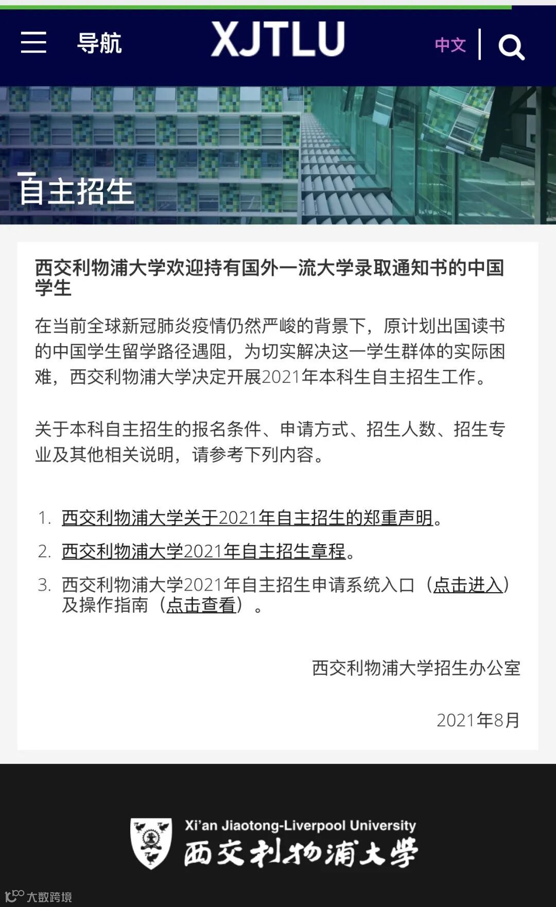 西交利物浦大学欢迎持有国外一流大学录取通知书的中国学生,开展2021年本科自主招生计划。