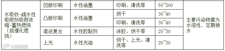 (五)使用水性油墨、光油和胶粘剂的生产线,难以回收的调配、涂墨、上光、涂胶等废气宜采用水吸收法,并搭配疏水性吸附剂吸附浓缩-蓄热燃烧(或催化燃烧)法处理。