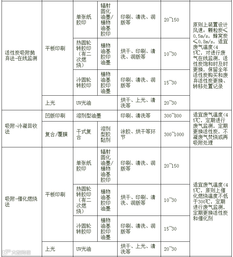 (一)调配、涂墨、上光、涂胶、烘干、清洗废气等应根据废气中污染物特征、风量、温度、湿度、压力以及实际工况等选择适宜的处理技术,详见表2。