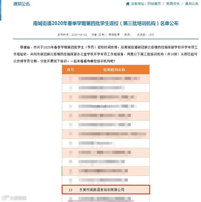 根据省、市关于2020年春季学期第四批学生(学员)返校时间安排,经南城街道新冠肺炎疫情防控指挥部学校开学专项工作组验收,并向市新冠肺炎疫情防控指挥部办公室学校开学专项工作组报备,同意以下第三批培训机构,从即日起可以安排学员分期、分批开展线下培训。【东莞英凯教育在名单中,意味着我们正式可以线下复课啦!】