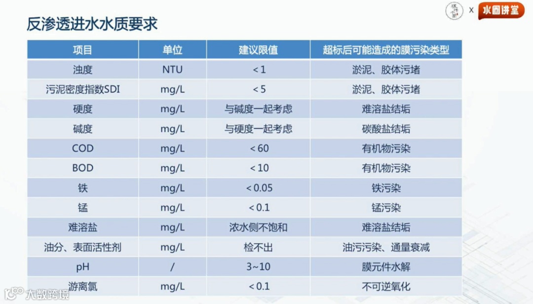 预处理出水指标有哪些?也就是反渗透进水水质的要求。这张表可以体现反渗透进水里最重要的水质参数。