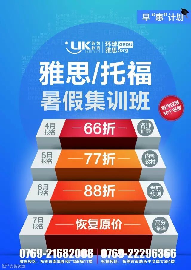 东莞英凯教育成立于2008年5月,由东莞英凯国际语言培训中心联手国际知名出国留学专家环球雅思学校共同协力打造,旨在为怀揣出国留学梦想的莘莘学子提供一个专业、高效、优能的出国留学英语考试培训基地,我们倡导“优享教育x快乐学习”。