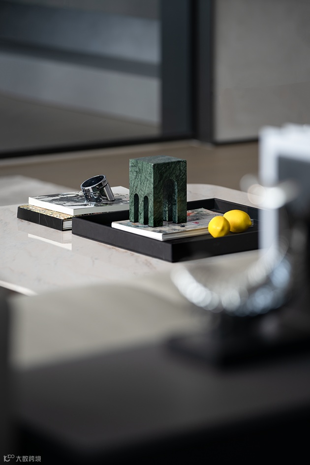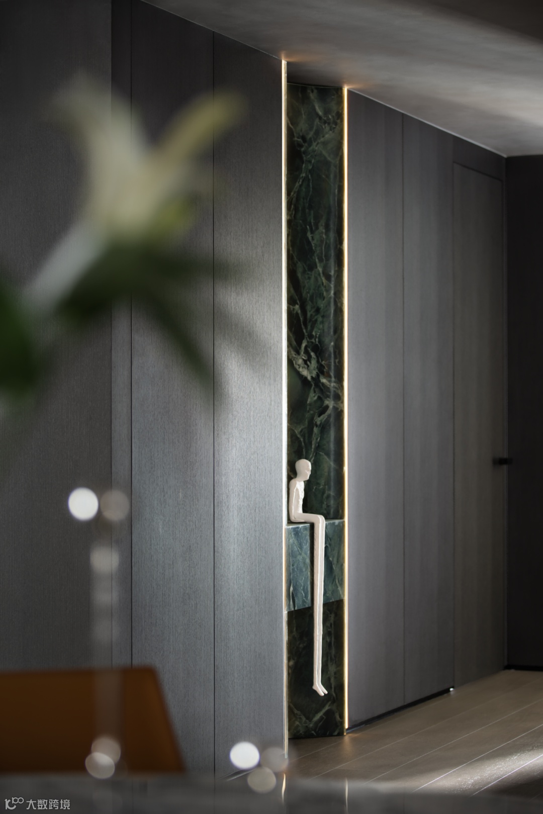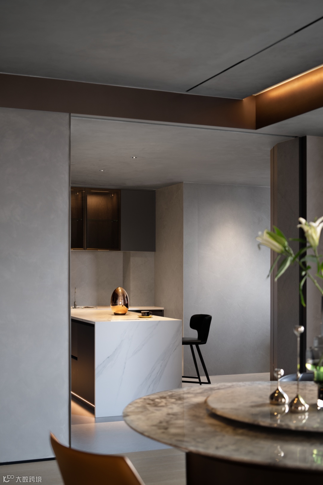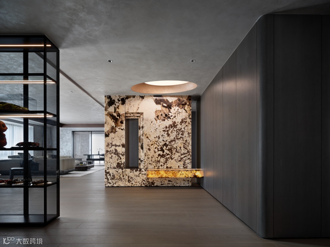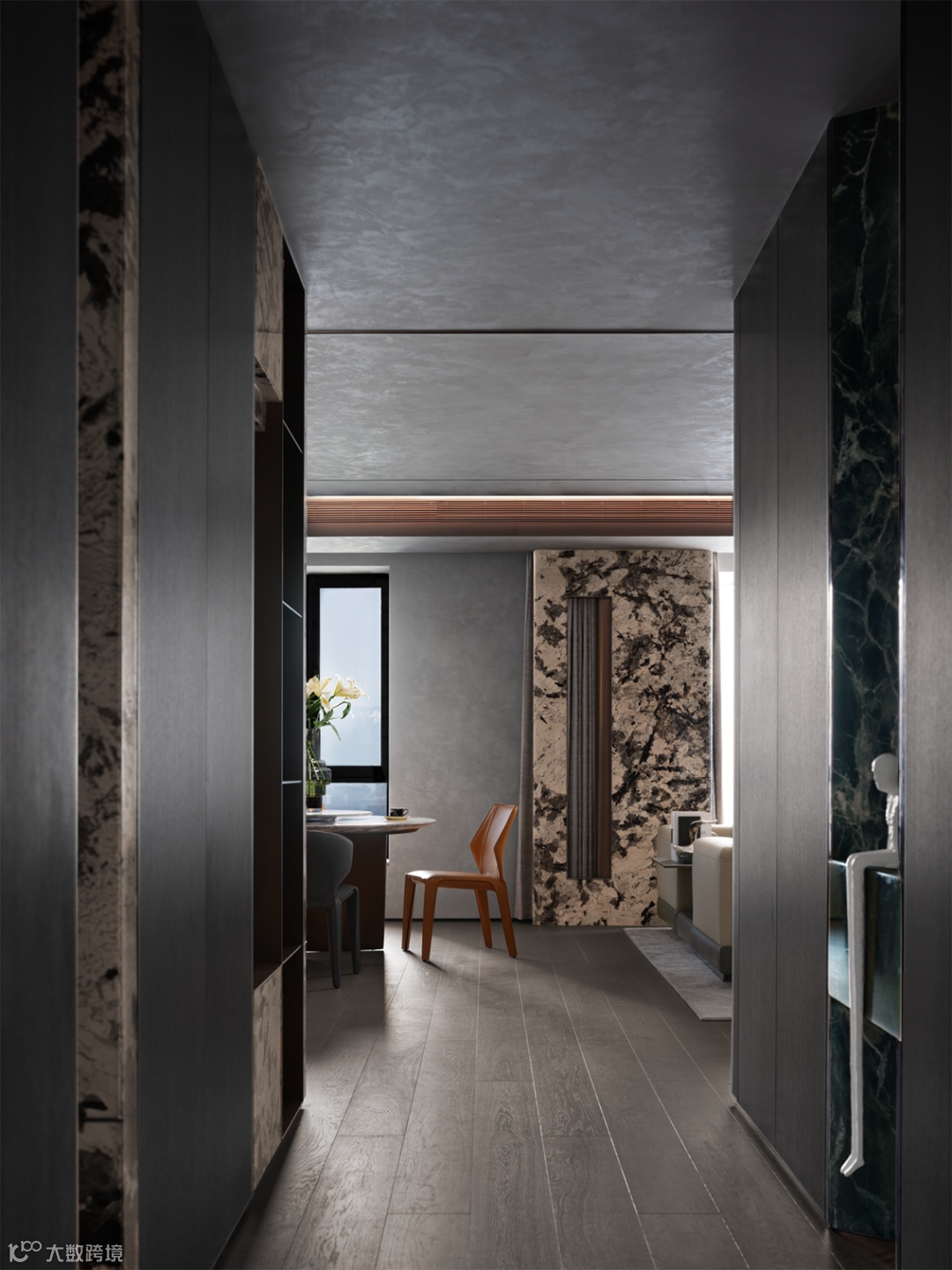 在空间的整体布局上,中性色为主,灰色阶以及木质的自然色调,营造出一种冷静而高雅的氛围,石材的点缀还赋予了整个环境以质感与沉稳的感觉。