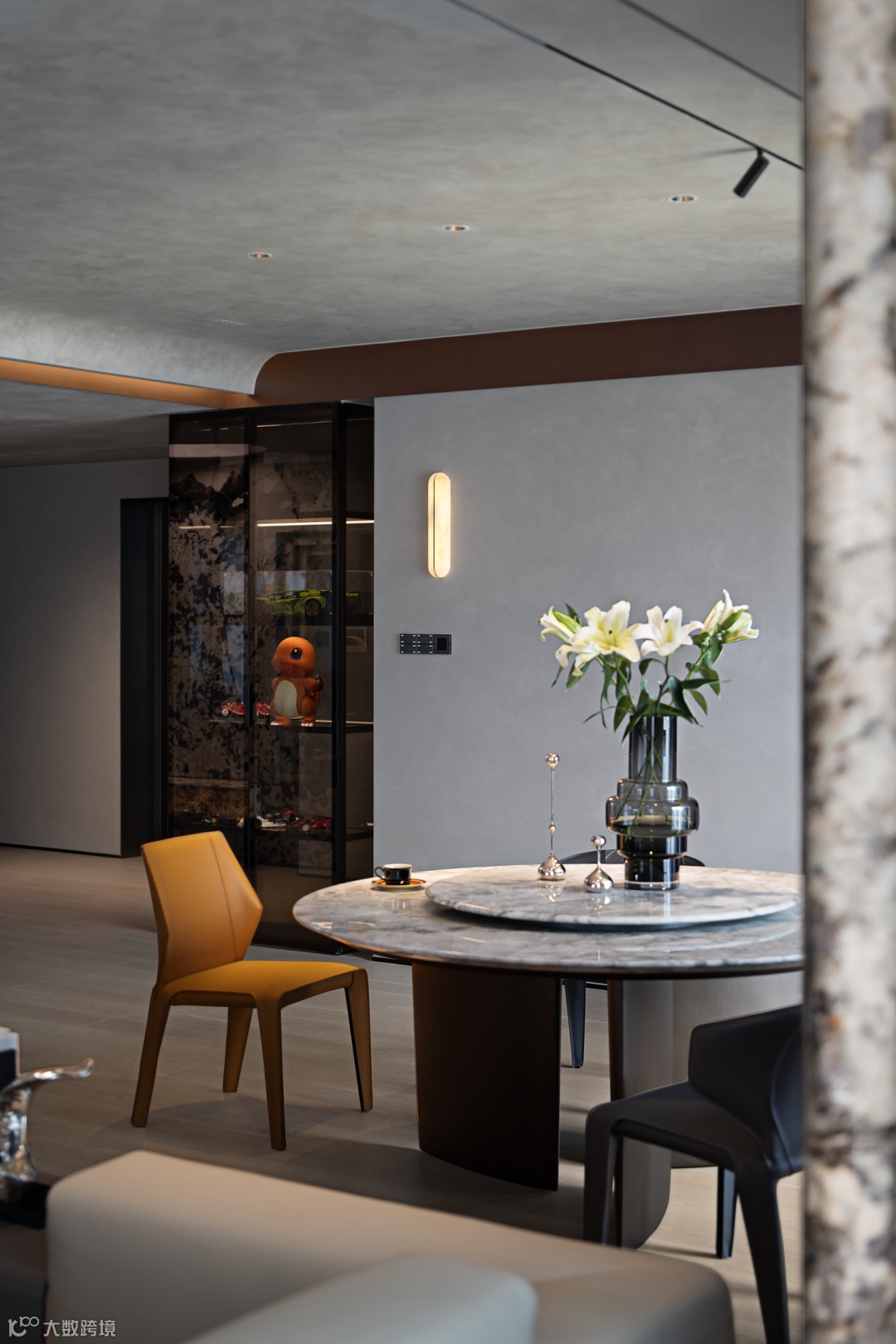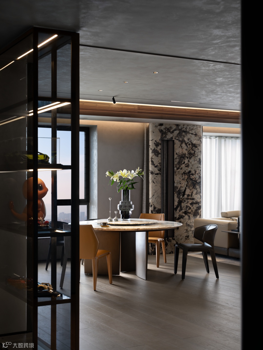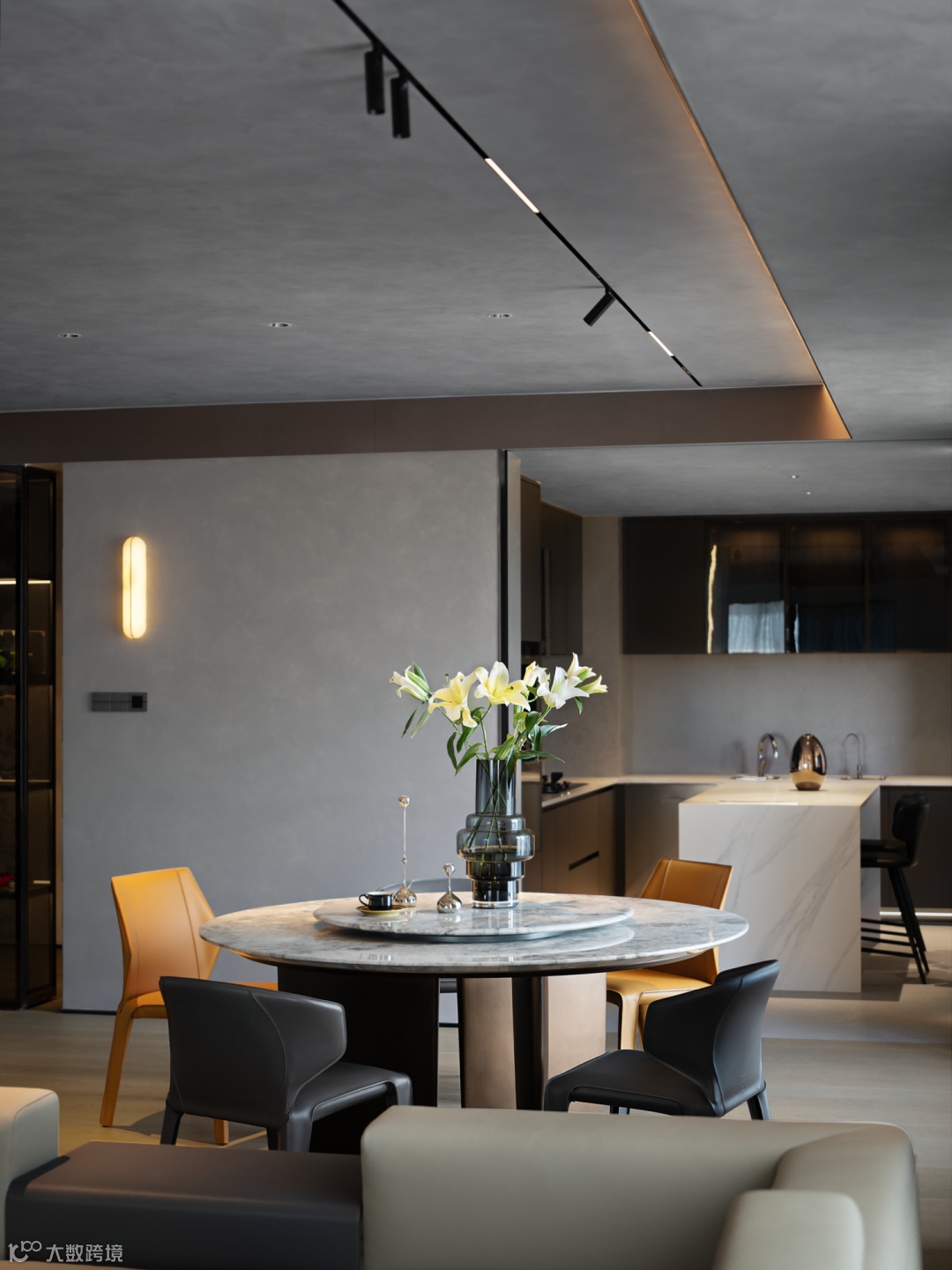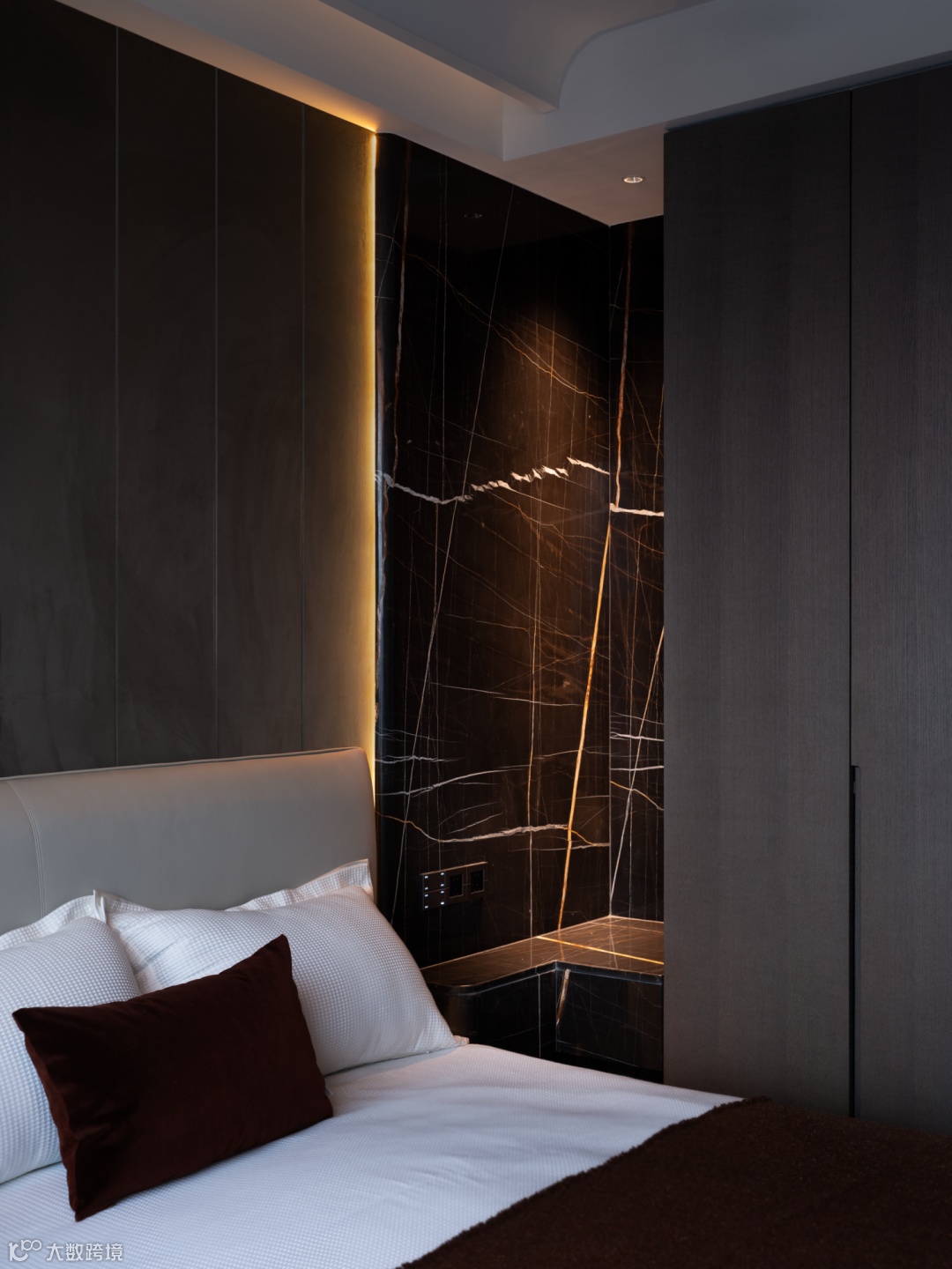 在空间的整体布局上,中性色为主,灰色阶以及木质的自然色调,营造出一种冷静而高雅的氛围,石材的点缀还赋予了整个环境以质感与沉稳的感觉。