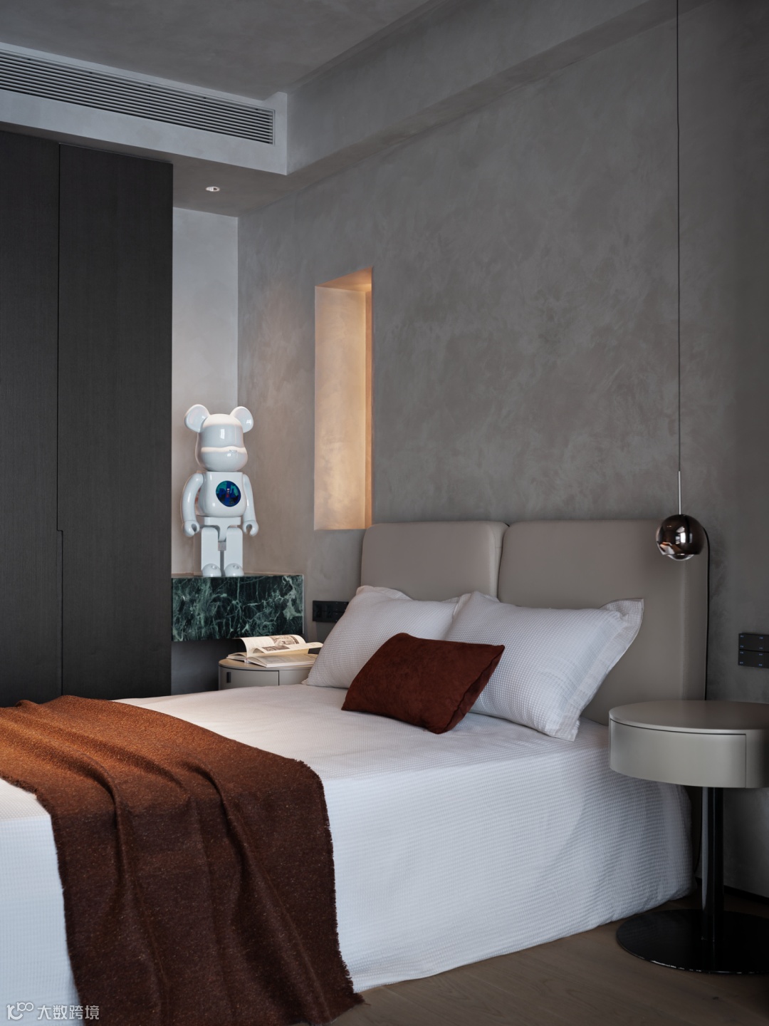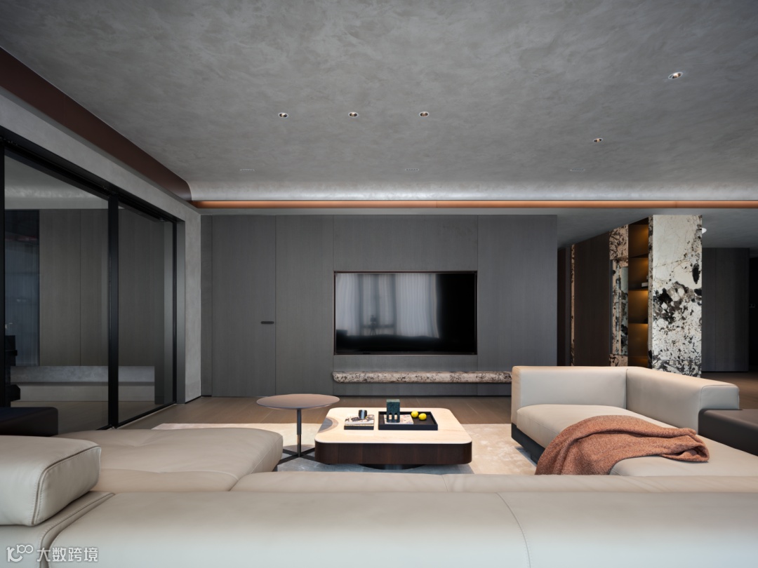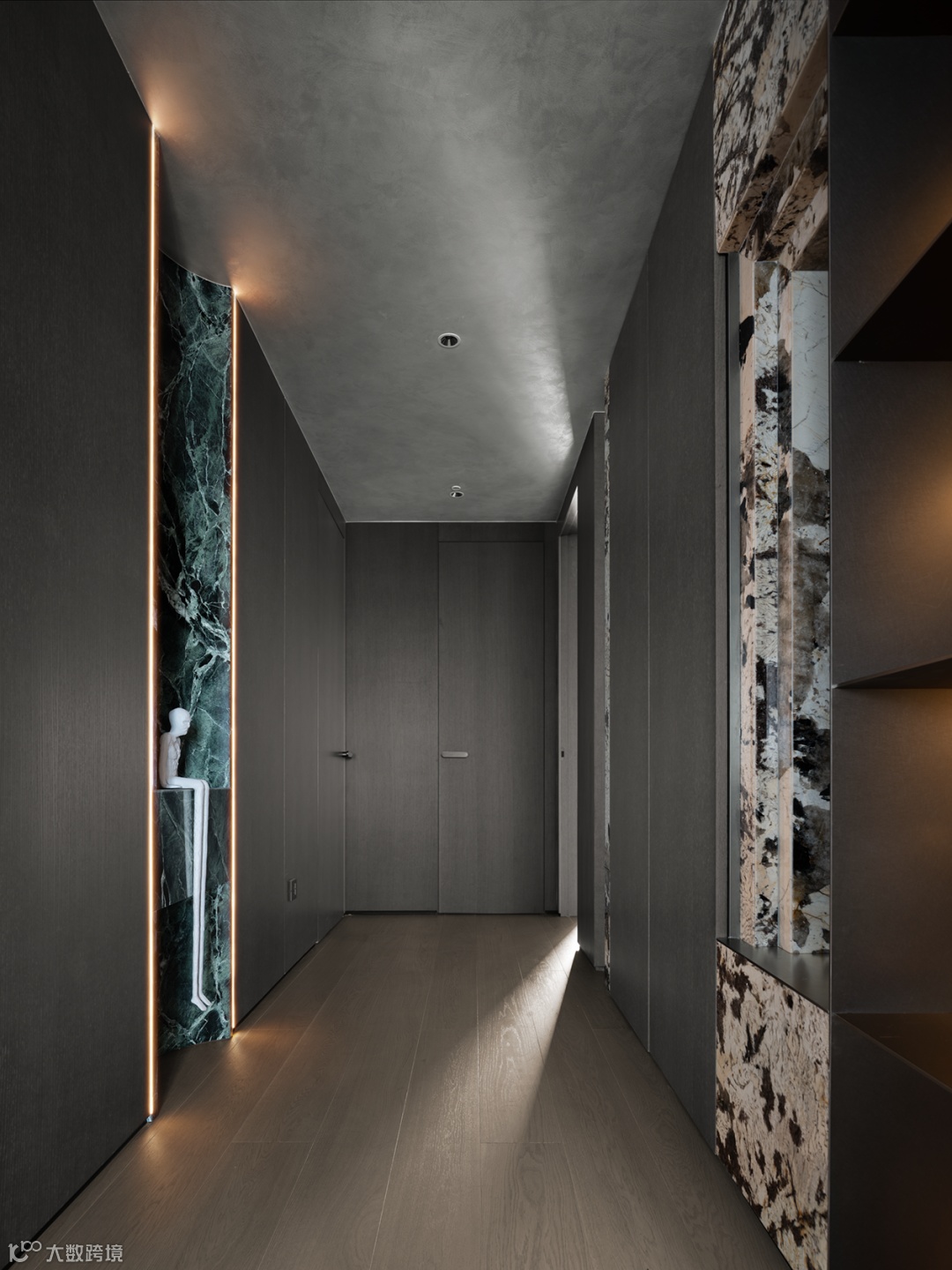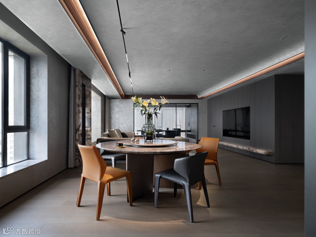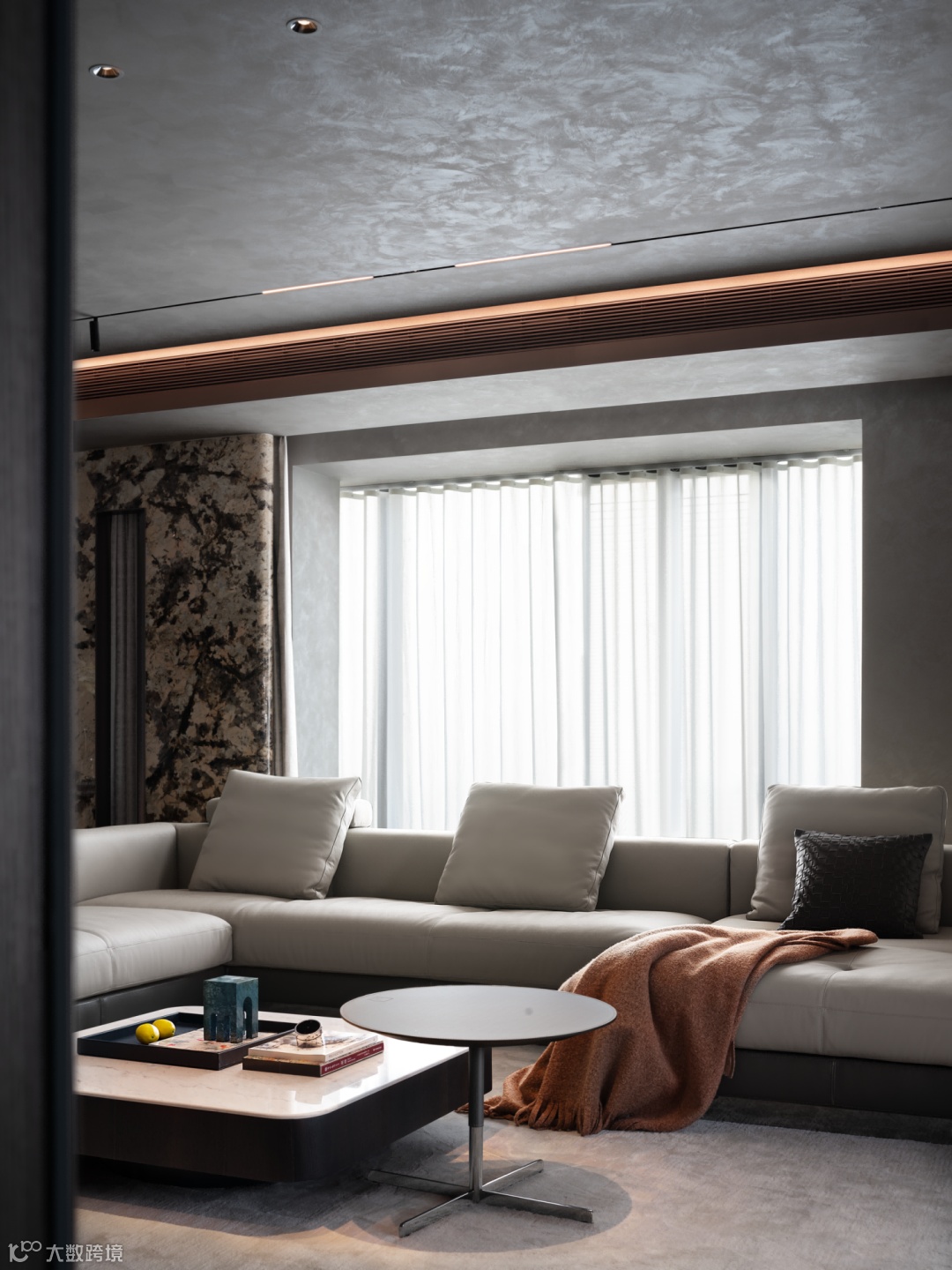 在空间的整体布局上,中性色为主,灰色阶以及木质的自然色调,营造出一种冷静而高雅的氛围,石材的点缀还赋予了整个环境以质感与沉稳的感觉。