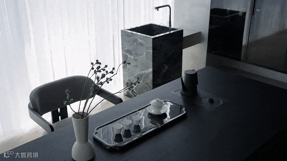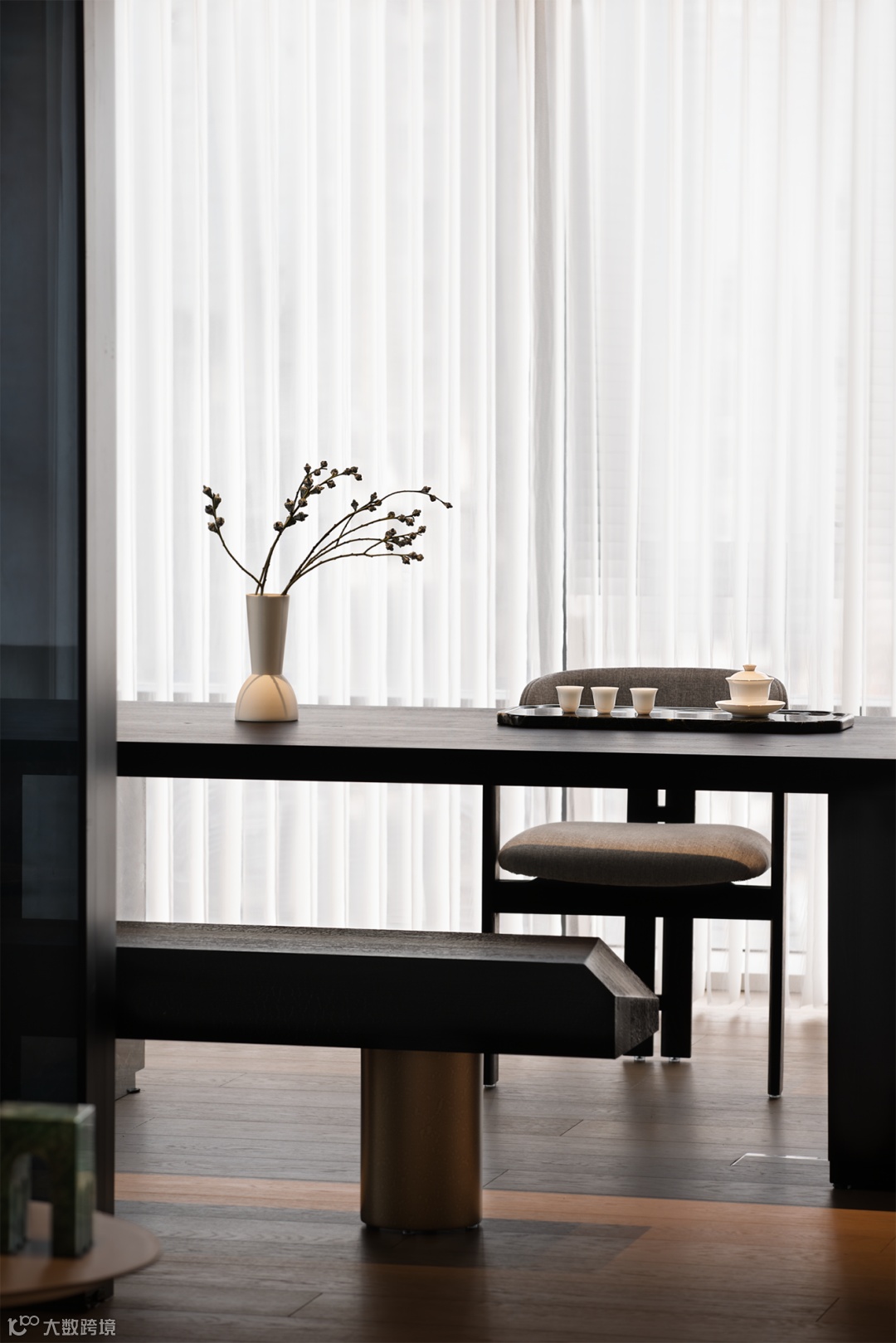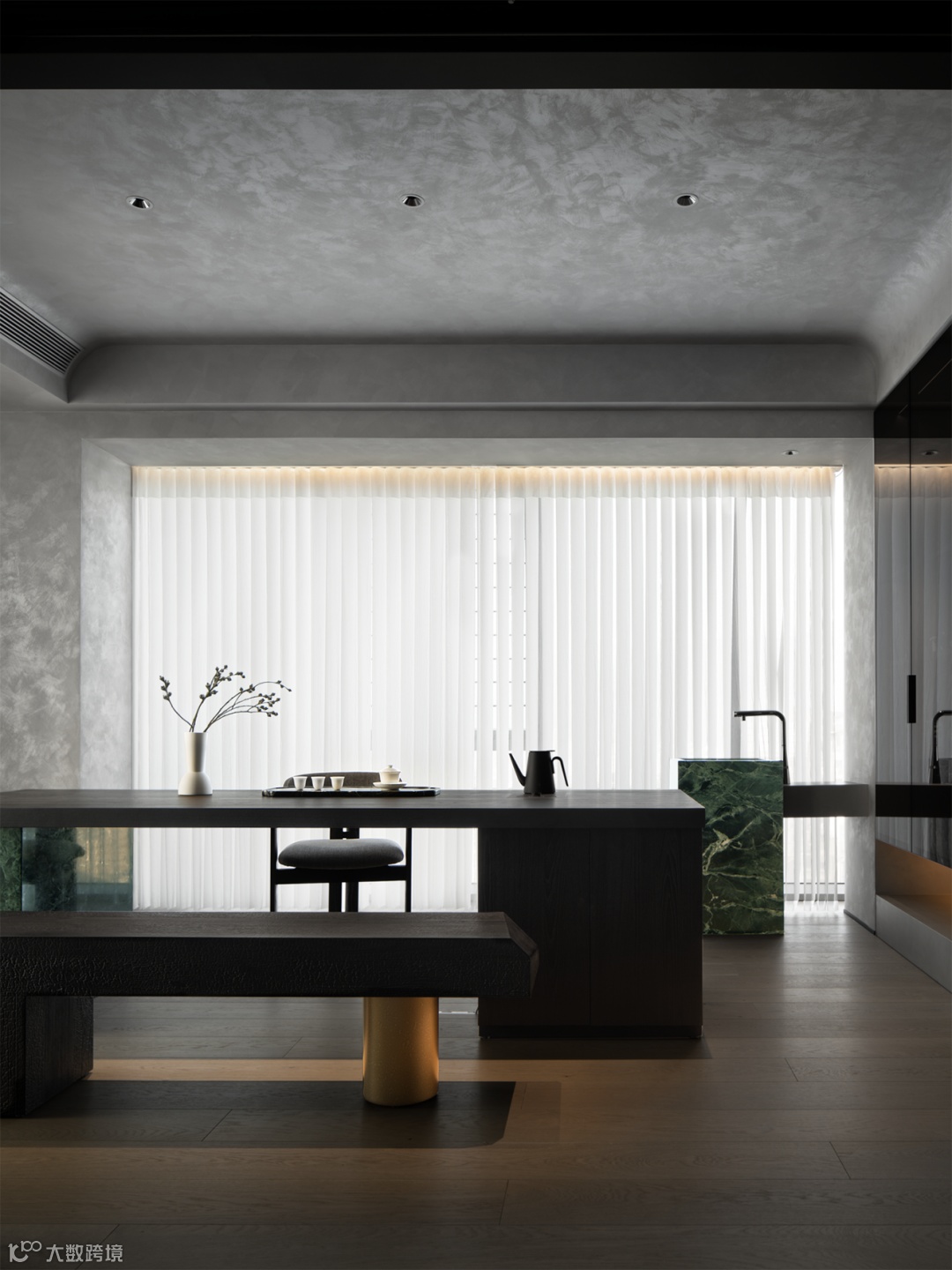 In the overall layout of the space, neutral colors dominate, with black, white, gray, and the natural tones of wood creating a serene and elegant atmosphere. The embellishment of stone materials further imparts a sense of texture and composure to the entire environment.