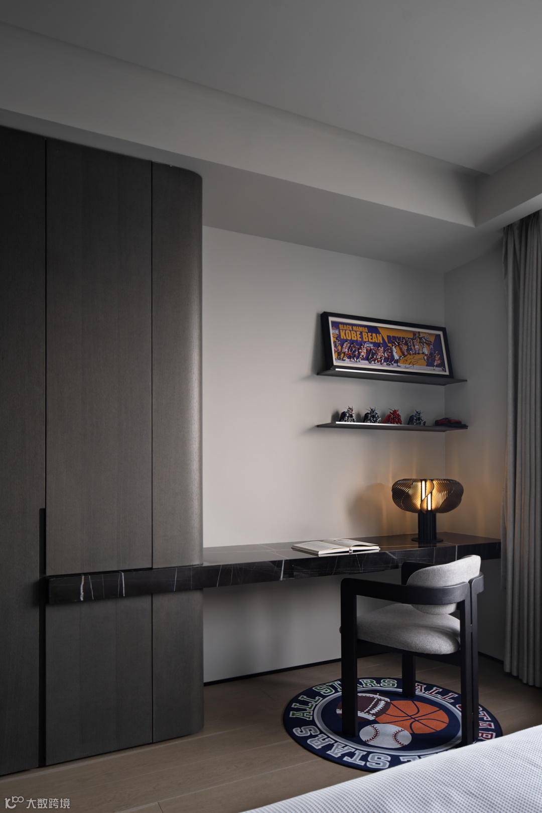小孩房在延续整体风格设计之中,用装饰来表达童趣、天真的活泼个性。大理石嵌入衣柜作为书桌更显新奇有趣,让孩子充满对生活的想象。