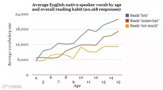 答案很明显,同是15岁的青少年,适量阅读的人有18000的单词储备,相当于3倍的六级词汇量,比不怎么阅读的人高了整整50%!