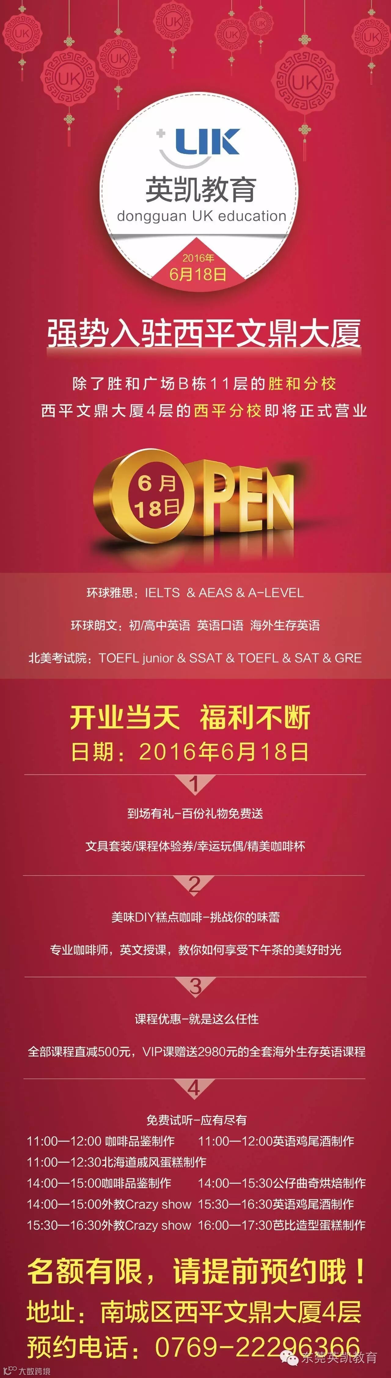 在你们的支持下,我们英凯教育的第二家分校--西平校区即将在2016年6月18日开始试营业,新校区在环球雅思的基础上,增加了北美考试院和环球朗文2个项目,为莘莘学子提供更为舒适的学习环境和更广泛的选择空间,我们提倡优享教育、快乐学习!