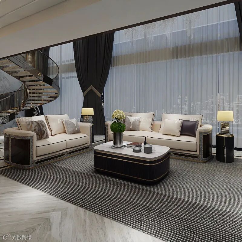 主要材料:慕冠家居全屋定制、尼斯木皮、尤加利木皮、金丝黑檀木皮、珍珠鱼皮、天然大理石
