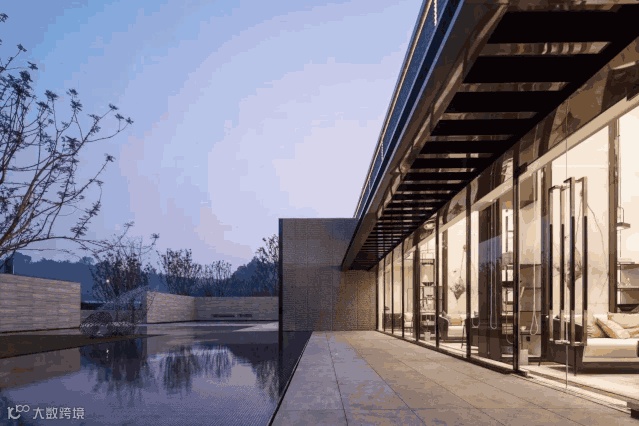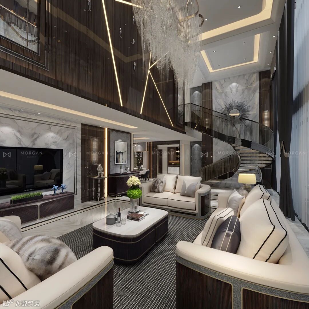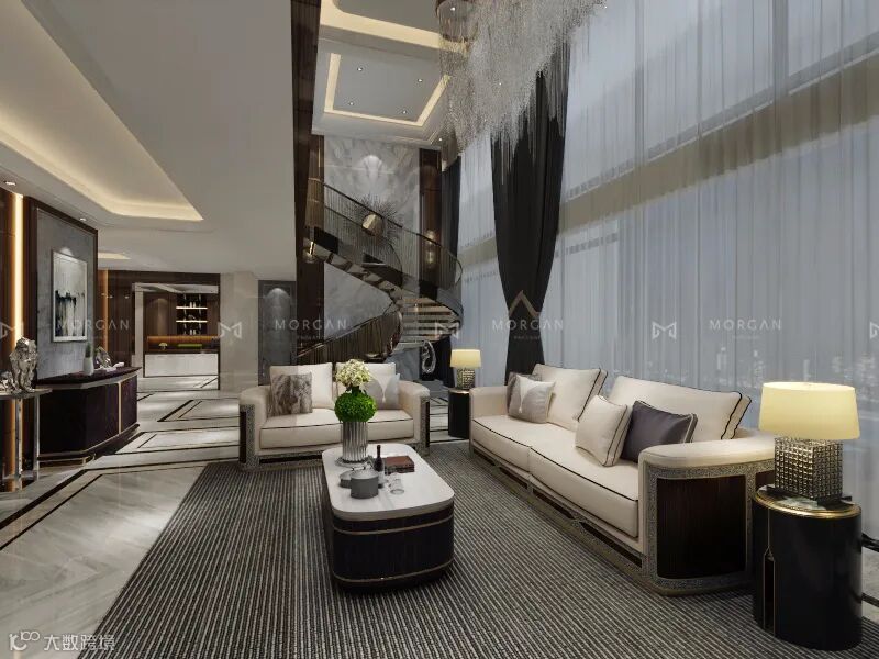 设计师透过现代的设计手法、新型的装修材料,将内外景观融合,并选用柔和的灰、咖色为主调,金丝黑檀木饰面板为主打材料,凸显别墅低调奢华的气派。整体搭配皮革沙发,感觉温暖自然又不失贵气。