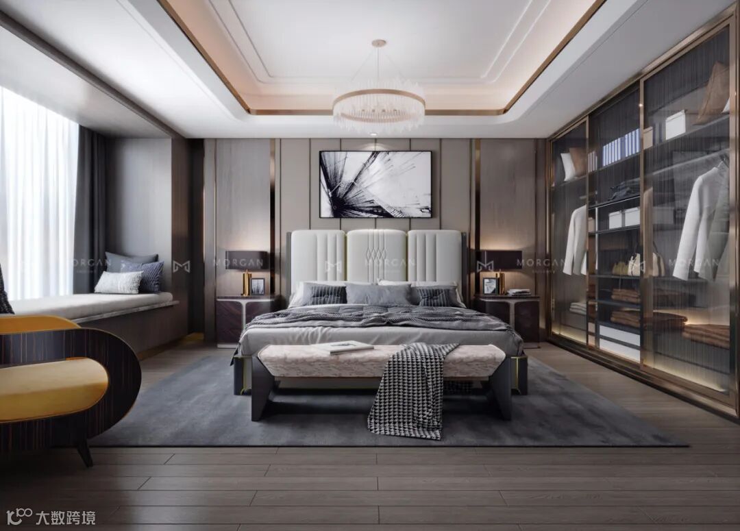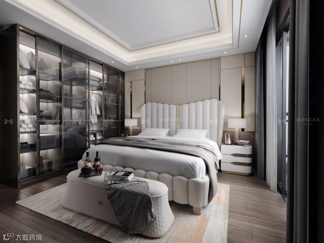区别于传统衣柜,慕冠全屋定制的衣柜配备透明玻璃门,给空间带来通透的时尚感,让光影在空间中流动。还配有中央抽屉、黄铜制成的挂架和榉木架,背板可以选用漆板或镜面装饰,顶部可悬挂钢架。