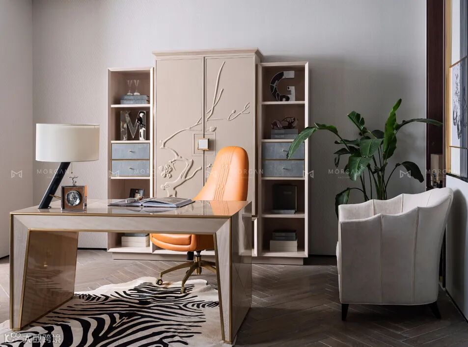 书房以沉稳为主基调,书架沿用了木皮饰面,配以智能感应灯带,绗缝真皮工艺,珍珠鱼皮镶嵌,每一处细节都彰显奢华。休闲椅精选高档珍稀珍珠鱼皮,个性十足。