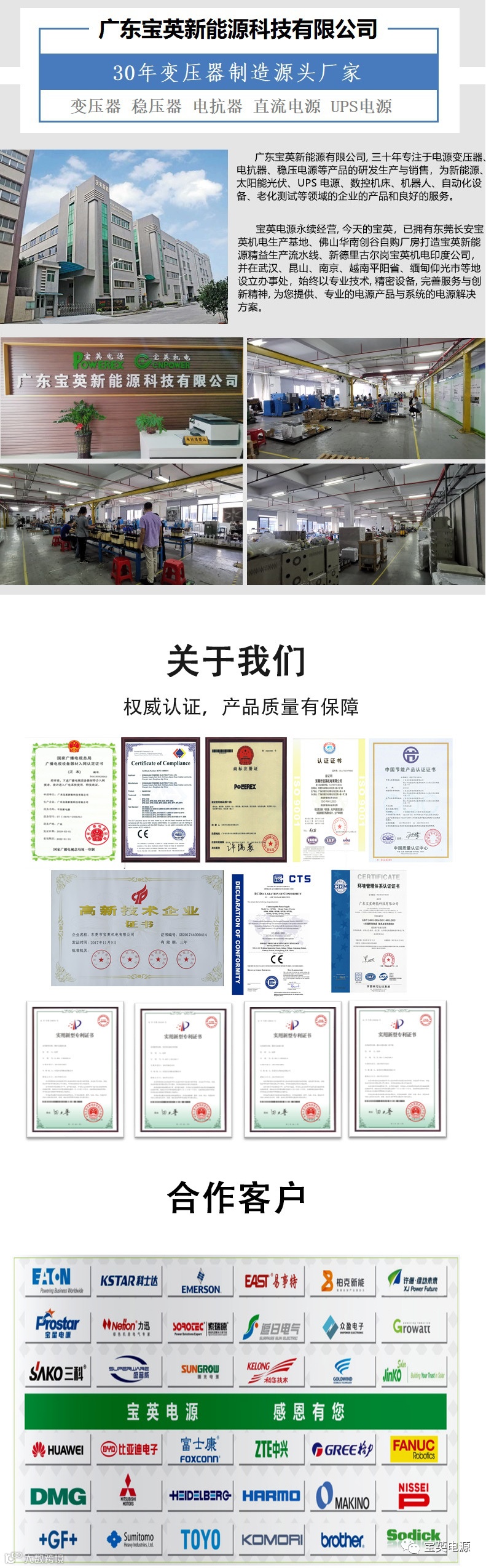 宝英公司三十年专注于新能源、电动汽车、太阳能光伏、UPS电源、数控机床、机器人自动化设备、老化测试等领域的电源变压器、电抗器、稳压电源等产品的研发生产与销售。