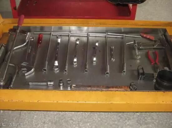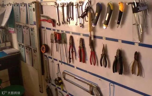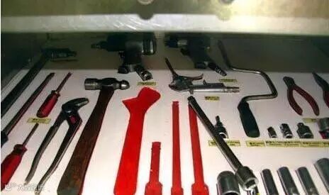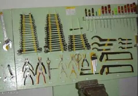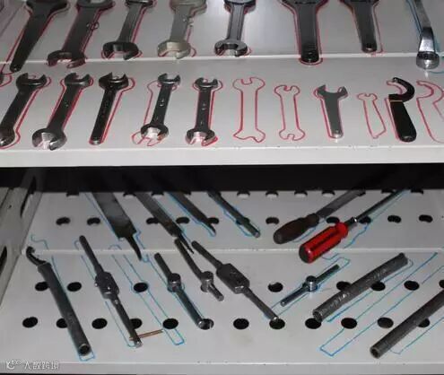 看下图,此工具5S管理,画了工具的行迹,少了工具一眼就能看的出来。