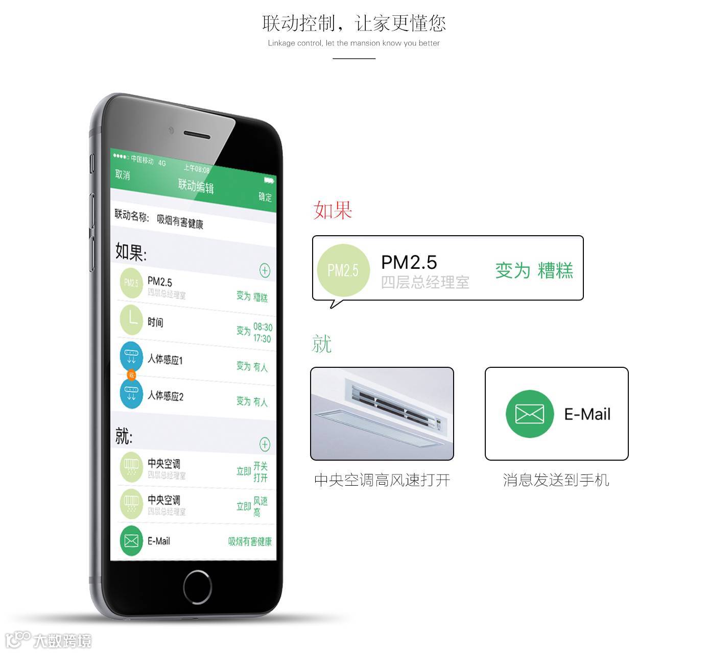 全屋PM2.5、二氧化碳、噪声、温度、湿度、光照度监测,实时监测并联动控制空调或新风,让家更懂你,温暖而贴心,呵护全家。