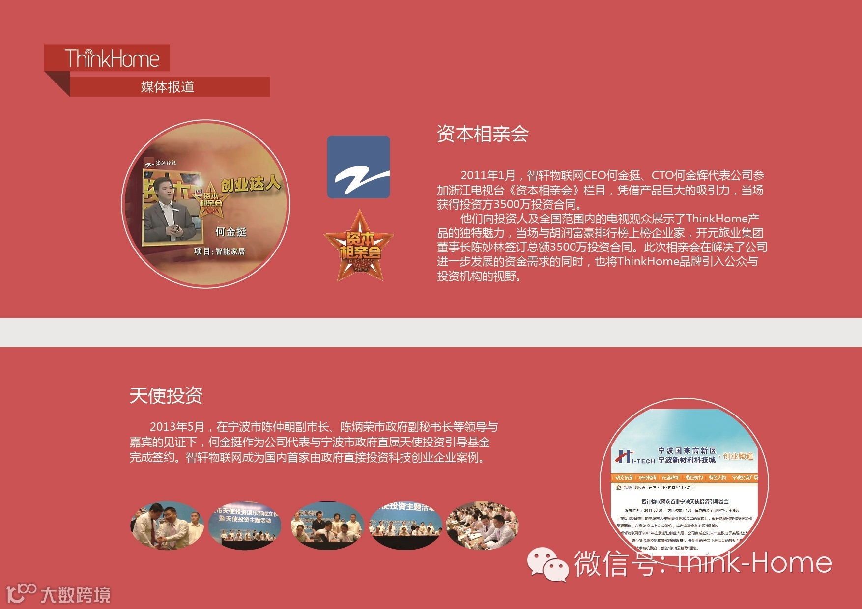 2011年1月,ThinkHome CEO何金挺、CTO何金辉,在浙江卫视《资本相亲会》栏目中,凭借公司自身对于智能家居的前瞻意识,独居魅力的产品理念,获得开元旅业集团董事长陈妙林的3500W投资金额。