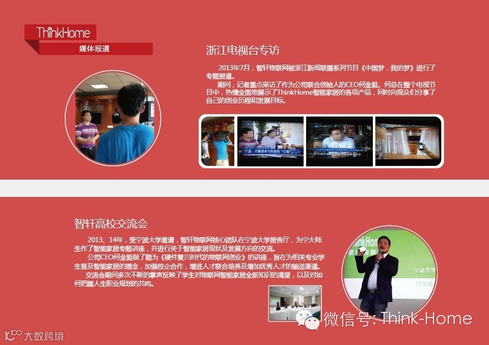 2013年7月,ThinkHome被浙江新闻联播系列节目《中国梦,我的梦》专题报道,CEO何金挺热情洋溢的展示了公司的产品。