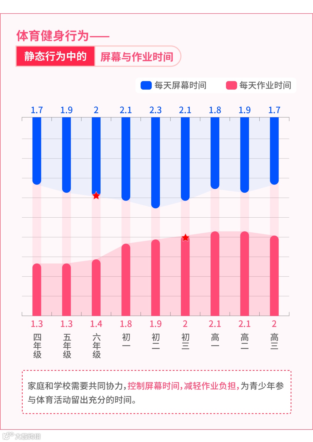 同时,随年龄增长呈递减的趋势十分明显。其中,在静态行为方式中,儿童青少年的屏幕与作业时间也在随着年级的增长呈现增长趋势。