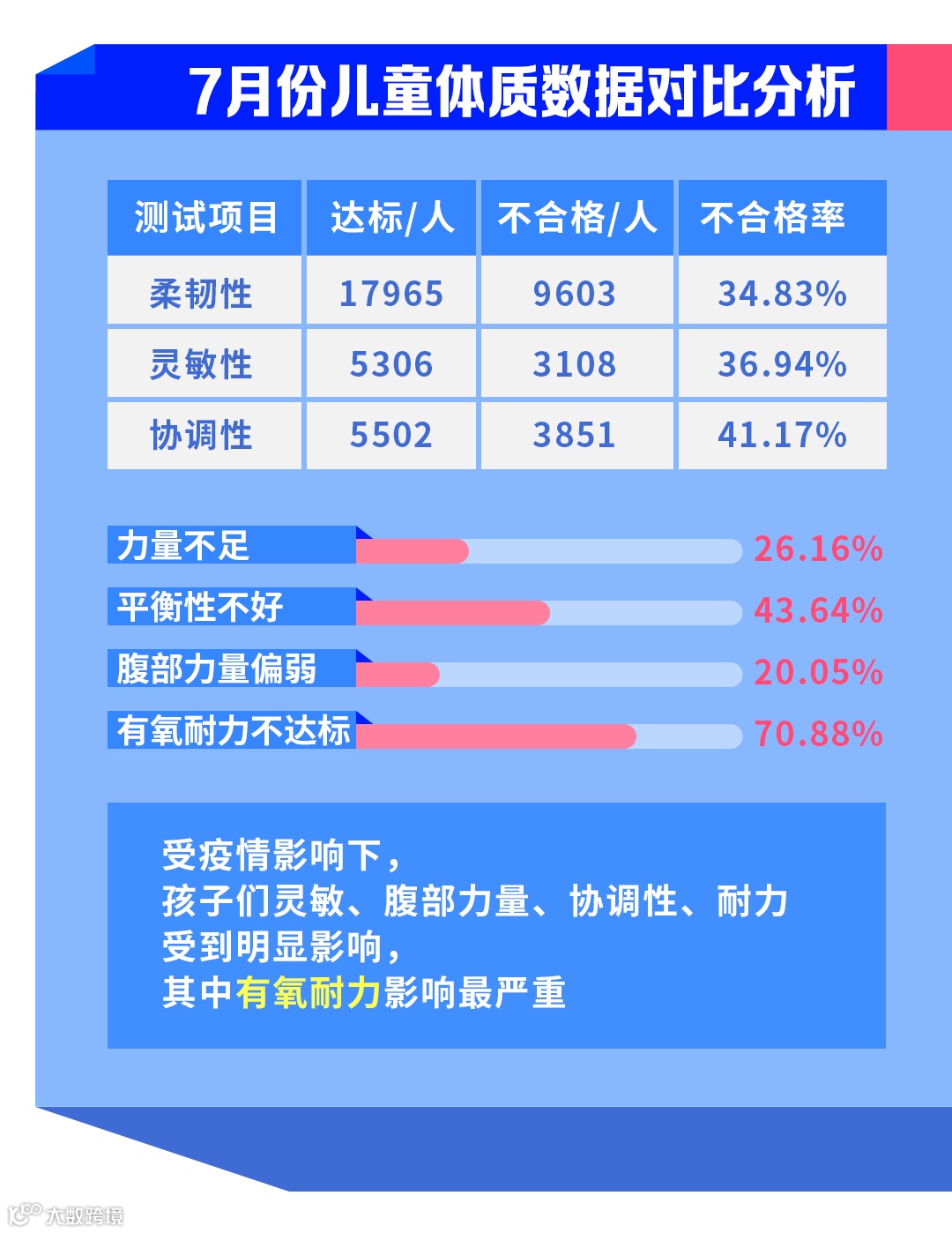 睿莱体测7月儿童体质大数据调查涉及35749名儿童,结果显示,34.83%的儿童柔韧性不合格、36.94%的儿童灵敏素质不合格、26.16%的儿童身体力量不足。