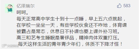 “每天正常高中学生十到十一点睡,早上五六点就起,在学校一坐坐一天,体育课被霸占是常态,休息日不不可也要上课外补习班。高三和艺考生睡眠是奢侈品,每天这样生活的孩子,体质不下降才怪!”
