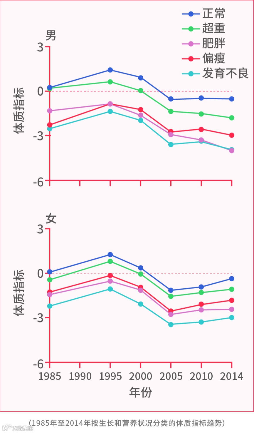 2019年第12期《柳叶刀·儿童与青少年健康》发表的最新研究回顾了1980年代以来的六次全国调查的数据。涉及7-18岁的儿童青少年150万人,身体素质从肺活量、立定跳远、仰卧起坐、50米跑和耐力跑等项目测量。研究指出,从1995年到2014年,中国儿童和青少年身体素质情况下降了167%。