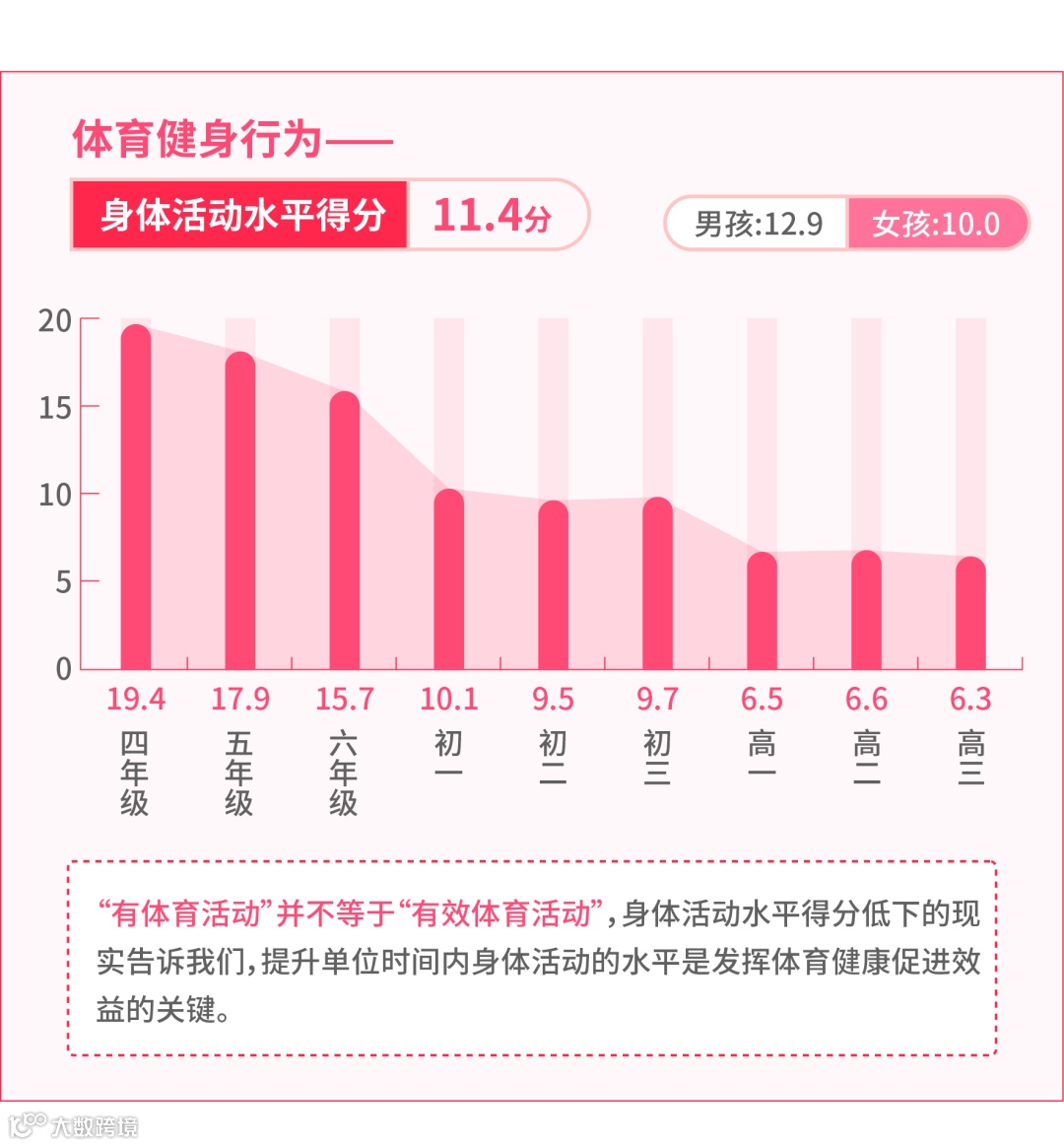 例如,小学生每天保证1小时中高强度身体活动的得分均值为17.7分,而初中生降到9.8分,高中生则降到6.5分。