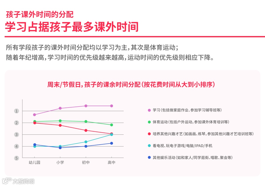 在《中国家庭身体素质培养》数据报告中显示,所有学段孩子的课外时间分配均已学习为主,其次是体育运动,随着年级增高,学习时间的优先级越来越高,运动时间的优先级则相应下降。