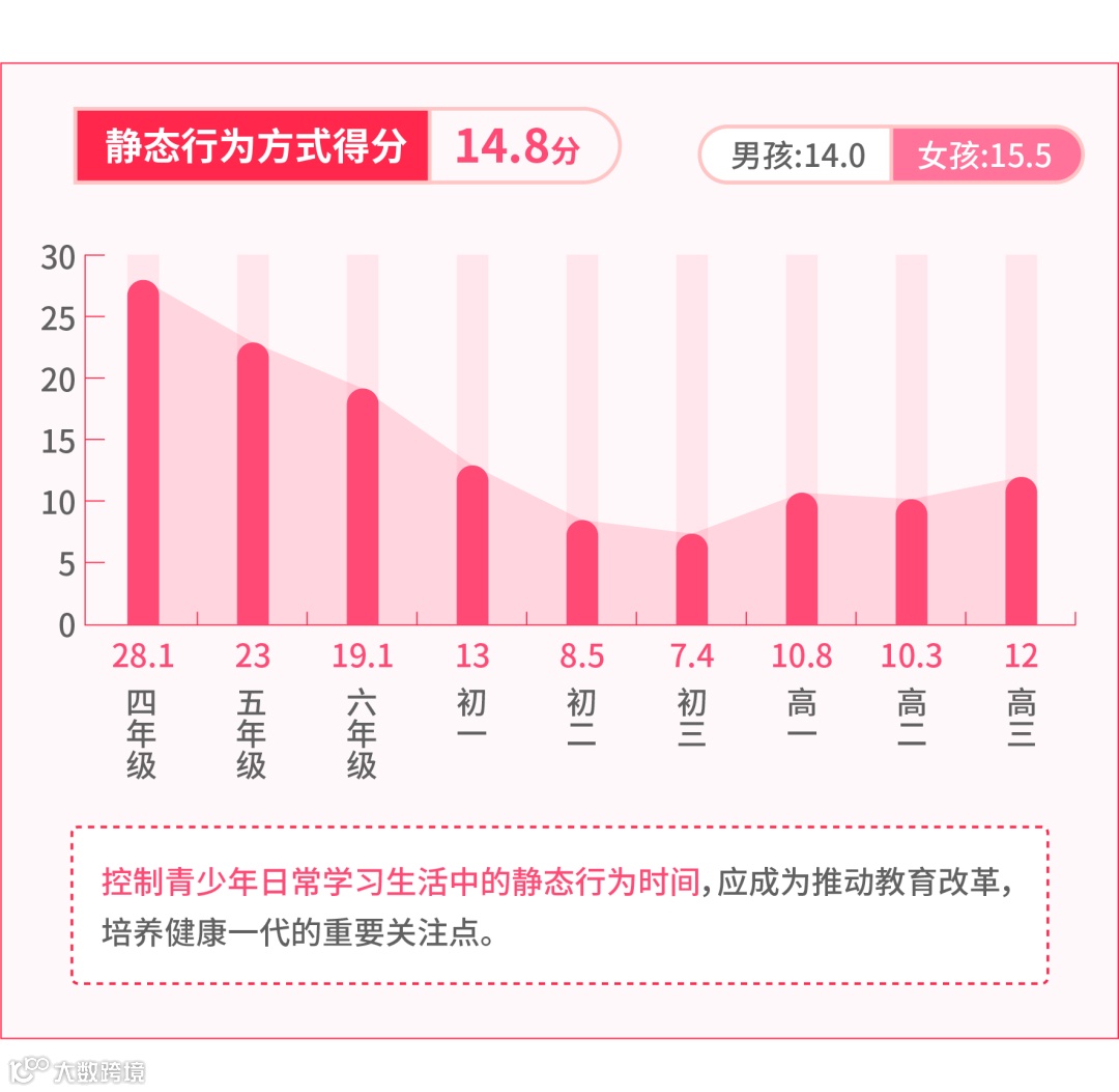 根据《中国儿童青少年体育健身指数评估报告》数据显示,我国儿童青少年静态行为方式(14.8分)的得分仍然处在很低的水平。