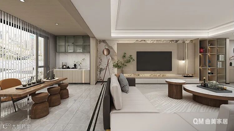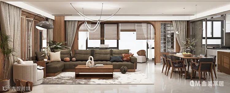 客餐厅作为公共空间,要让父母住得舒服,就要兼顾他们的使用习惯。对老人来说,坐低矮沙发会起身比较困难,选择高脚,左右有扶手且坐感偏硬的沙发对父母相对友好,也方便扫地机器人进入打扫。不少老年人视力下降,带有阳台的客厅,明亮通透,又能满足老年人侍弄花花草草的需求。
