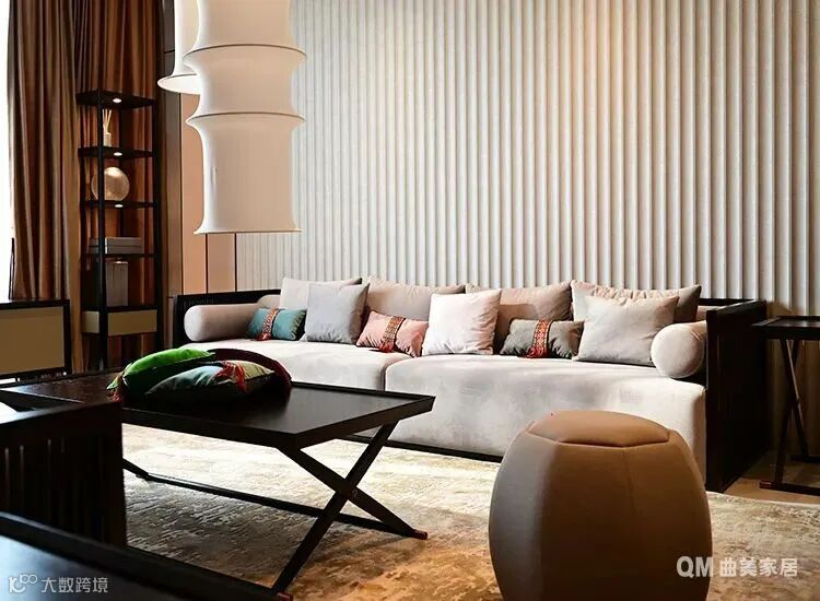 如果空间足够大,不想放弃传统客厅功能的,可将沙发作为分界线,书桌放置在沙发后,利用沙发做隔断分区,定制一组收纳书柜,就是一个开放式工作区。成年人不要做选择题,家庭图书馆和影音室我都要。