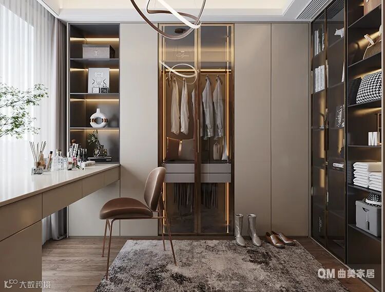虽然拥有一整面墙的鞋子包包是每个女人的梦想,但方便实用是衣帽间的第一准则。因此大多衣帽间采用定制化设计,能根据空间大小的实际情况,合理设计制造出合适的衣柜、梳妆台等,提升空间的利用率。