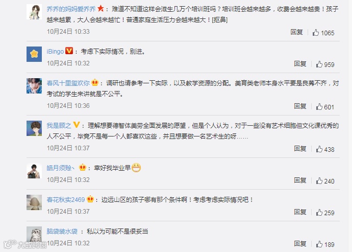 有观点认为:教育部以考核的方式强制性要求学生在美育上花费更多的时间,这的确会促进学生在这方面的进步,但由于掌握一门艺术需要一定的时间,因此短期内可能达不到很好的效果。