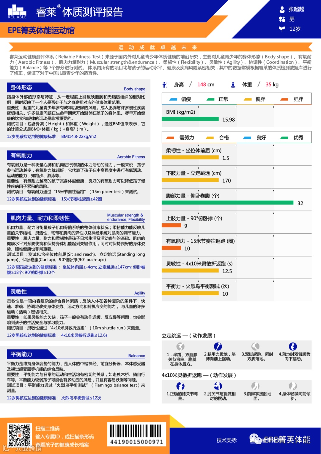 EPE的体测报告,覆盖国标标准,同时涉及到孩子全身7个核心要素的测量,耐力,敏捷,协调,柔韧,爆发力,速度,平衡力,全面的测量出孩子在成长发育过程中体能方面的优势与劣势,结合科学的训练模式,帮孩子完成体能逆袭!