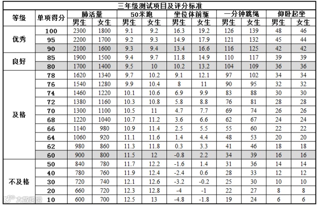 小学生体育达标的国家标准中有很大变化:增加了肺活量;减少了立定跳远;三年级开始有仰卧起坐;五年级开始有耐力跑。另外,还增加了BMI指数(体重公斤数除以身高米数平方得出的数字)的测量,不仅要经常锻炼,还要注意饮食,不能是小胖,也不能太瘦。
