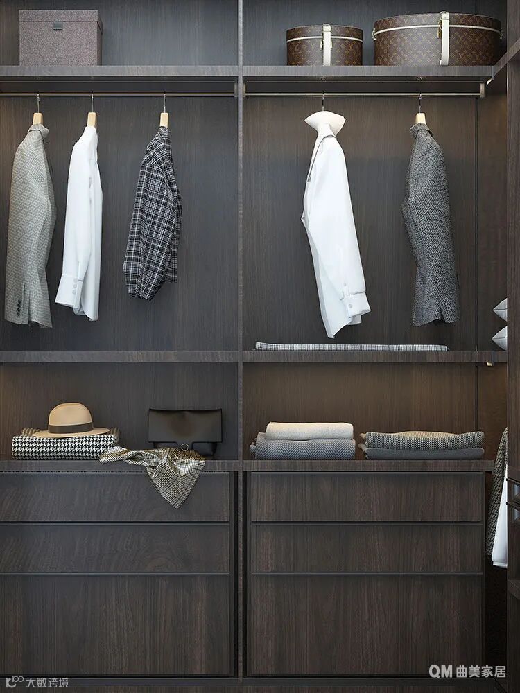 衣帽间位于主卧,以深色木质衣柜盛放男女主人四季衣物及饰品,极大的收纳功能基本上满足了女主人对于收纳的所有需求。