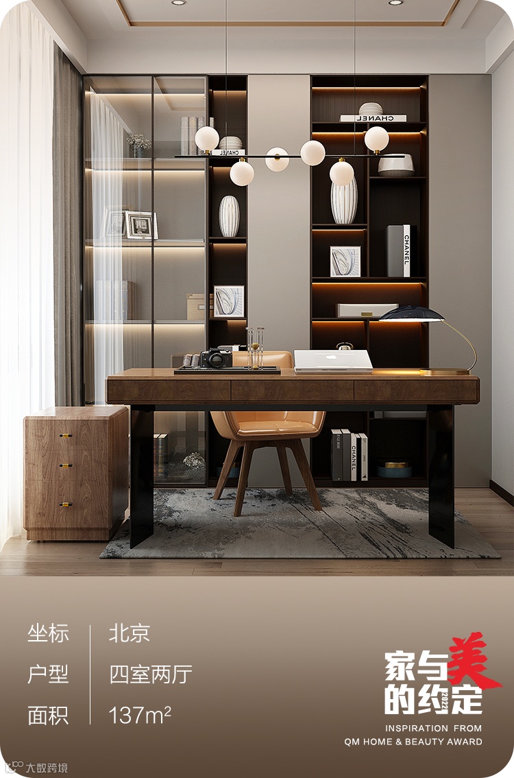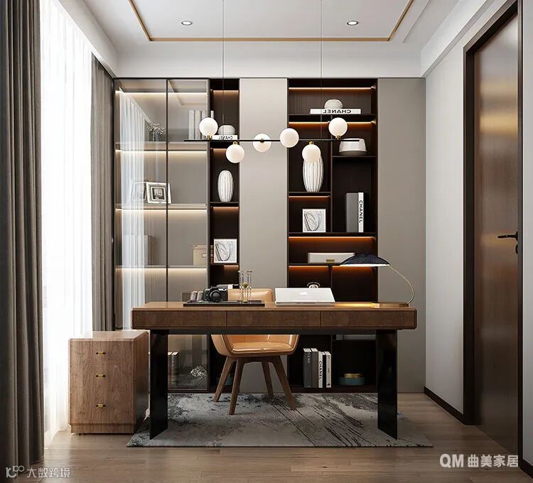 依然延续了玻璃柜门的设计风格,深色边框+灯带的设计,让书房多了肃穆的厚重感,在书籍或者其他工艺制品的点缀下,书房的功能性就此展现。简简单单的原木色书桌,可以满足户主基本的办公及学习需求。