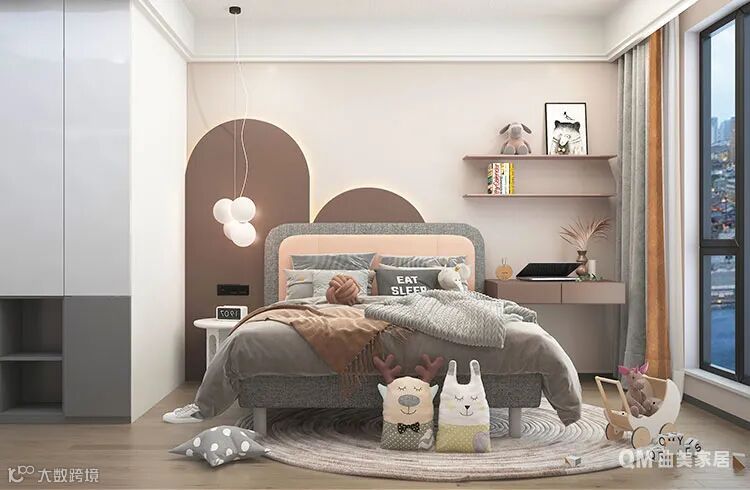 粉色系的女儿房大概是整个空间中最温柔可人的一隅,有一个小的化妆台可以学习做作业,浅粉色的墙面跟可爱的小吊灯呼应,个性化的圆形地毯,让整个空间更加俏皮。